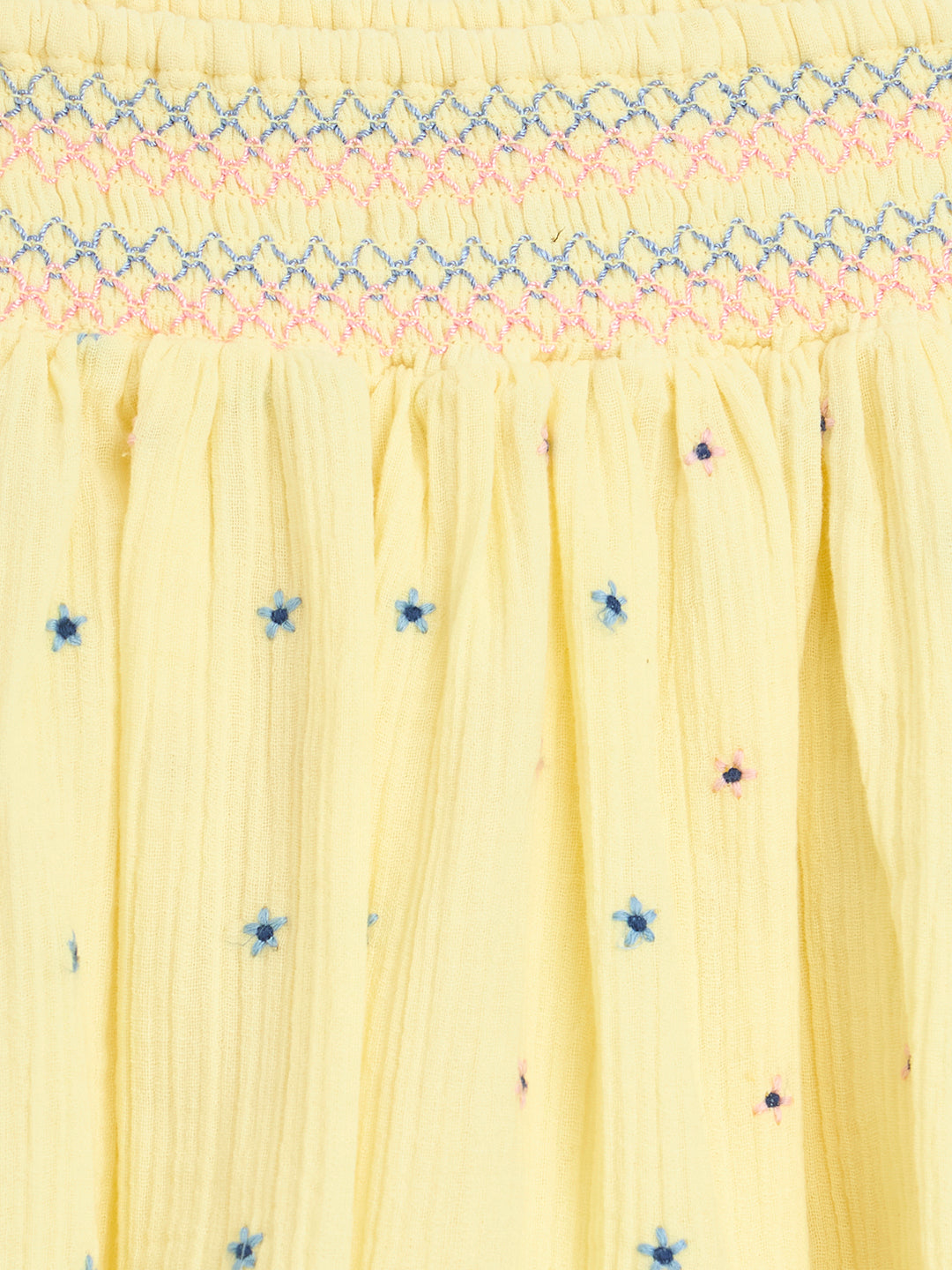 Brighten up your wardrobe with our smocked a-line skirt in a cheerful yellow hue. Designed for girls, this skirt features a fit and flare silhouette that adds a playful touch to any outfit. The embroidered pattern enhances its charm, making it perfect for both casual outings and special occasions. Crafted from pure cotton, it ensures comfort and breathability all day long. The mid-rise design and elastication closure provide a snug fit while allowing easy movement. Pair it with a simple top for a stylish and effortless look.