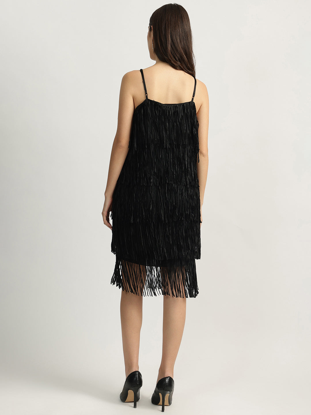 Sleek and sophisticated, this sleeveless black dress features a fitted self-design pattern for a flattering silhouette. The shoulder straps and zip closure add a touch of elegance, while the polyester fabric ensures comfort and breathability. Perfect for evening events or a night out.