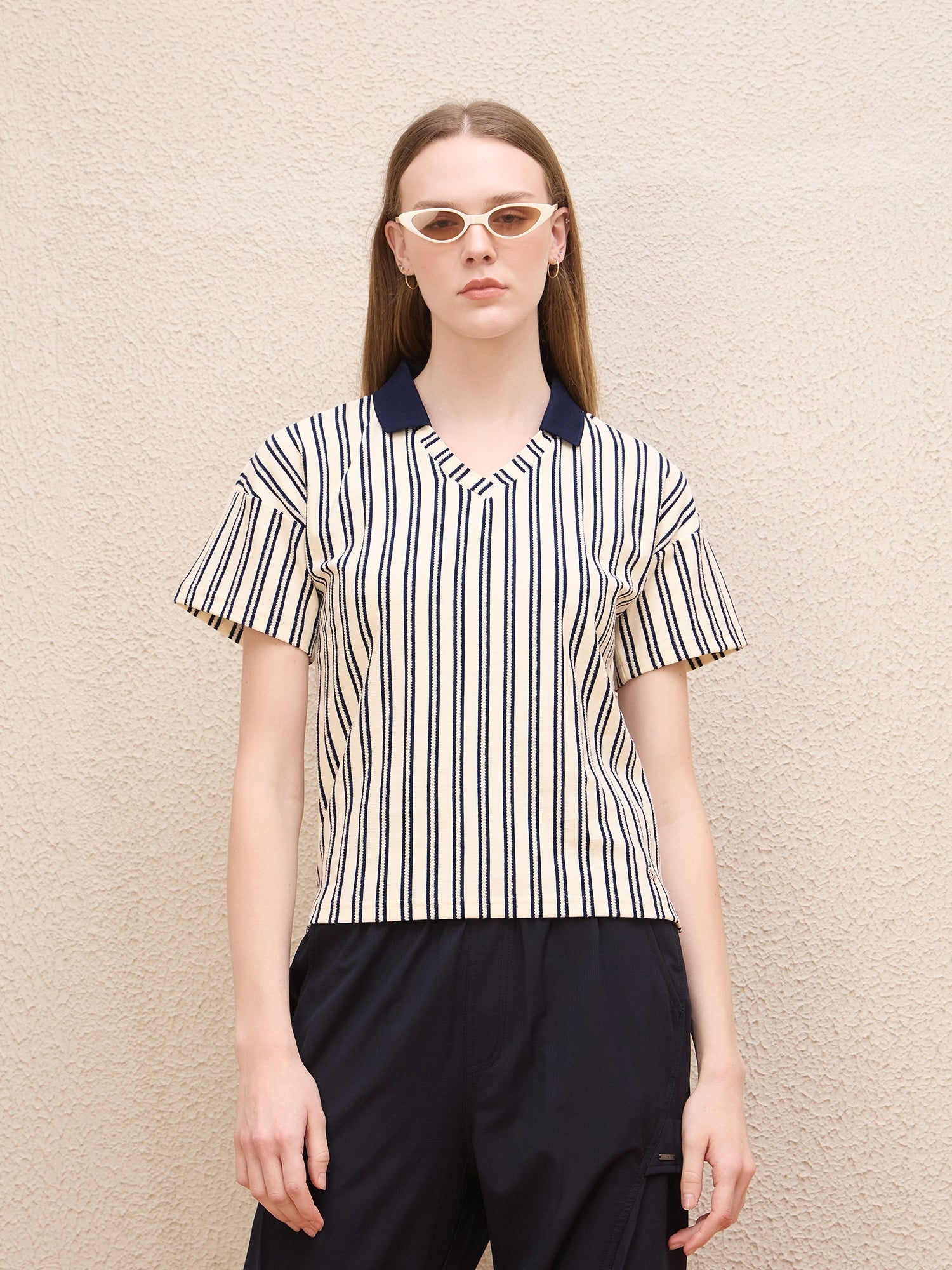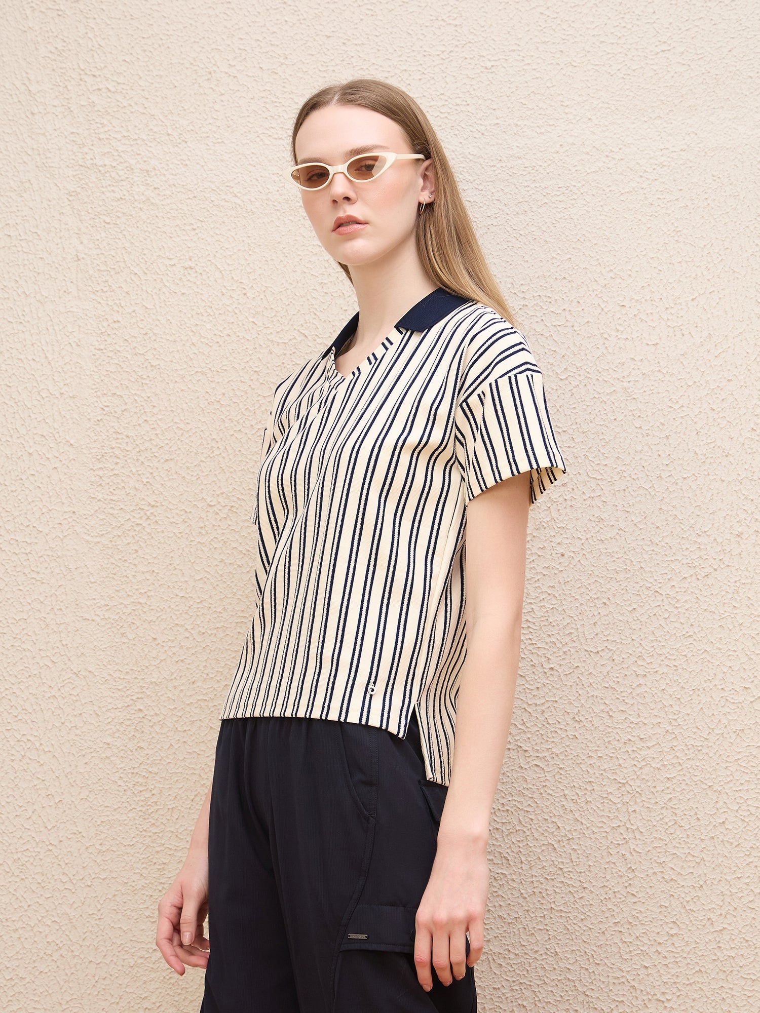 Discover the perfect blend of style and comfort with our cream-colored t-shirt for women. Featuring a classic regular stripe pattern, this short sleeve tee is designed with a chic jonny collar that adds a touch of elegance to your casual wardrobe. Made from pure cotton fabric, it ensures breathability and softness against your skin. The pull-on closure offers ease of wear, while the stretchable material provides a flattering fit that moves with you. Whether youre dressing up for a day out or keeping it casual at home, this versatile t-shirt is an essential addition to your collection.