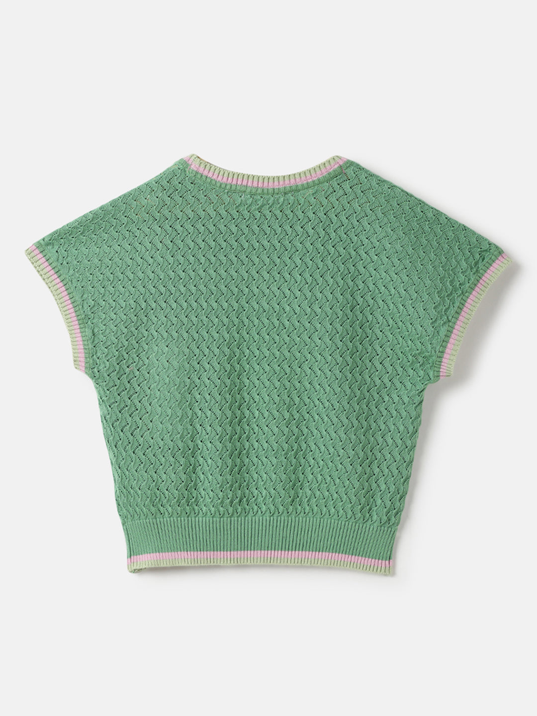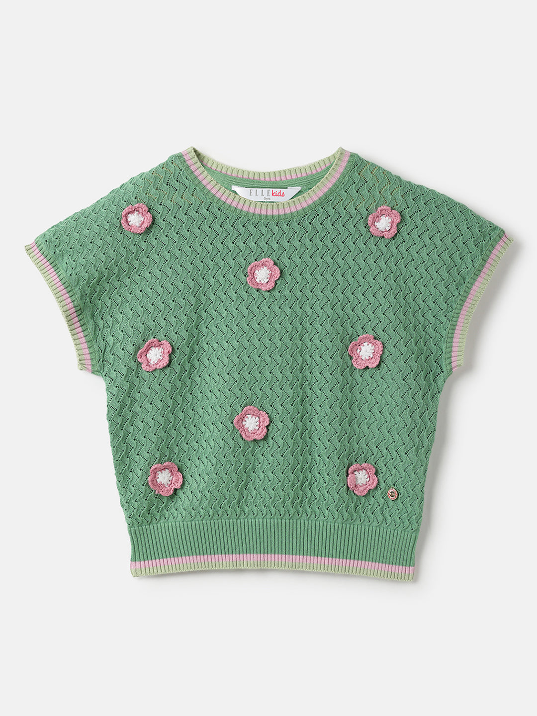 Discover the perfect blend of style and comfort with our green knitted top for girls. This charming piece features a box fit adorned with delightful floral appliques, adding a touch of whimsy to any outfit. Crafted from soft cotton fabric, it offers a breathable and comfortable wear. The cap sleeves and round neck design provide a classic look, while the pull-on closure ensures easy dressing. The stretchable flat knit structure enhances flexibility, allowing for all-day comfort. The 3D flower applique adds an extra dimension of fun and elegance, making it a must-have addition to any wardrobe.