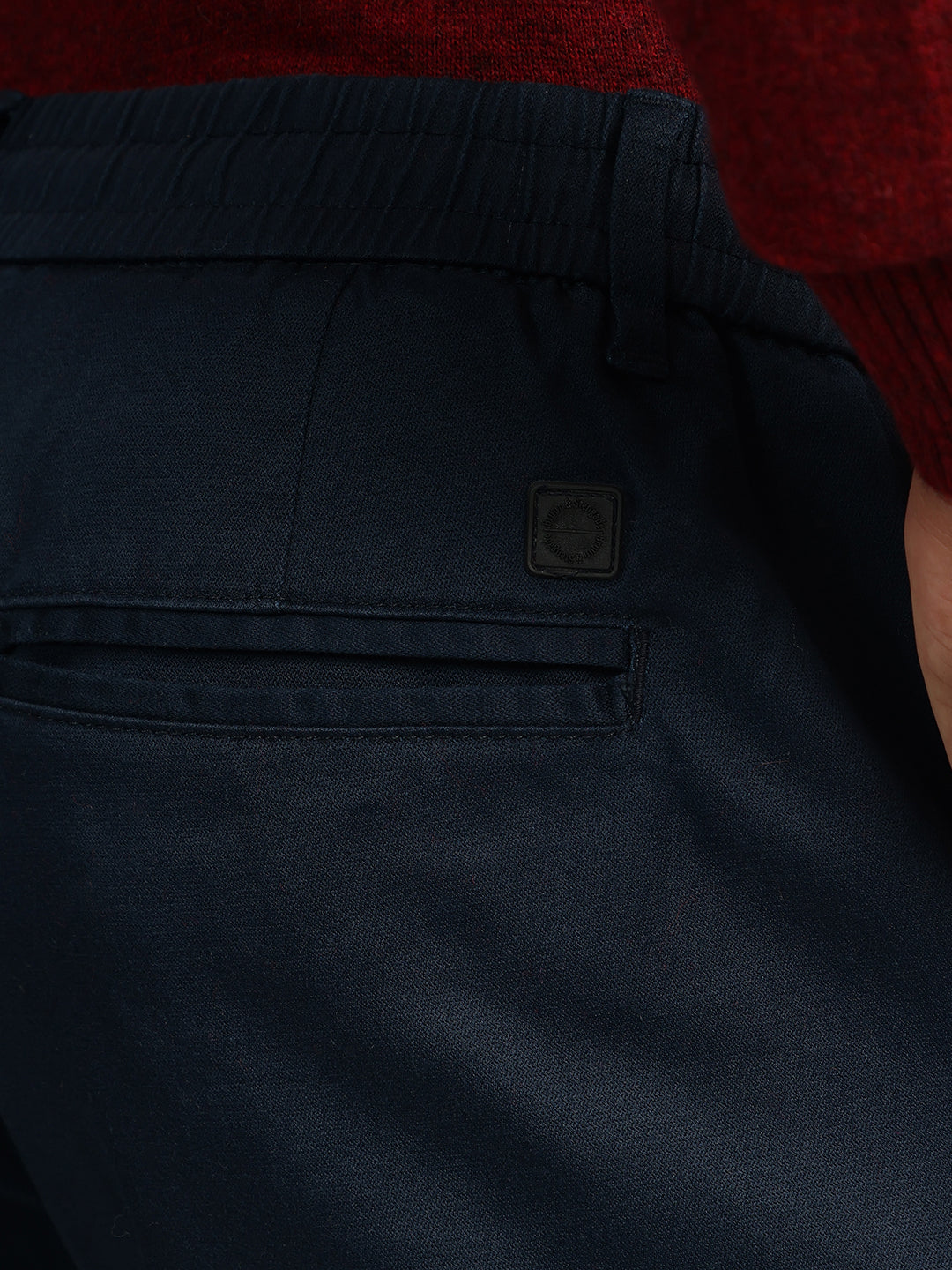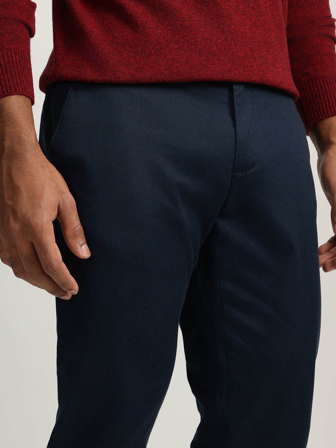 Elevate your style with these classic flat-front trousers. Crafted from a comfortable cotton blend, they feature a regular fit, mid-rise waist, and a button and zip closure. The solid blue hue adds a touch of sophistication, making them perfect for both casual and smart casual occasions.
