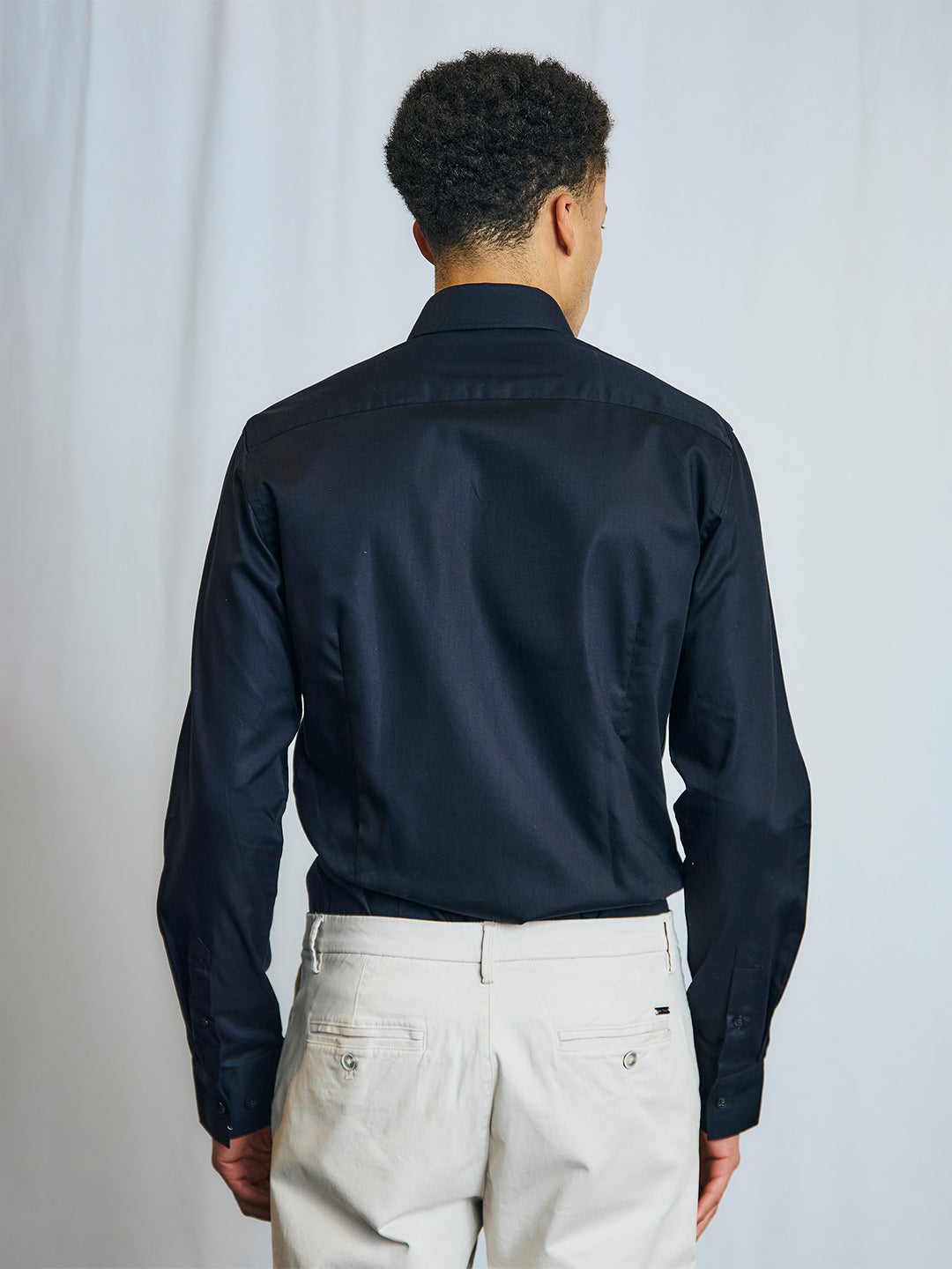 Elevate your style with this sleek blue slim-fit shirt for men. Crafted from premium cotton, it features a solid pattern, full sleeves, and a spread collar. The button closure adds a classic touch, making it perfect for both formal and casual occasions. Experience comfort and sophistication in one versatile piece.