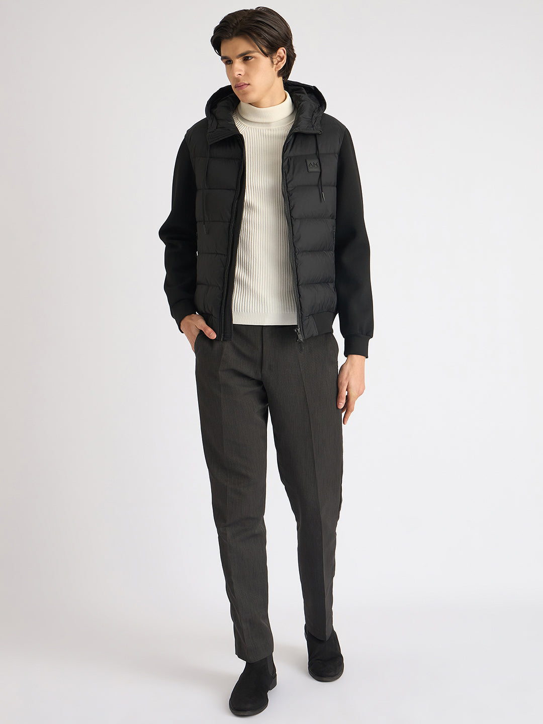 Sleek and modern, this black puffer jacket is crafted from lightweight polyamide for warmth and comfort. Its slim fit and full sleeves offer a flattering silhouette, while the hood and zipper closure provide protection from the elements.