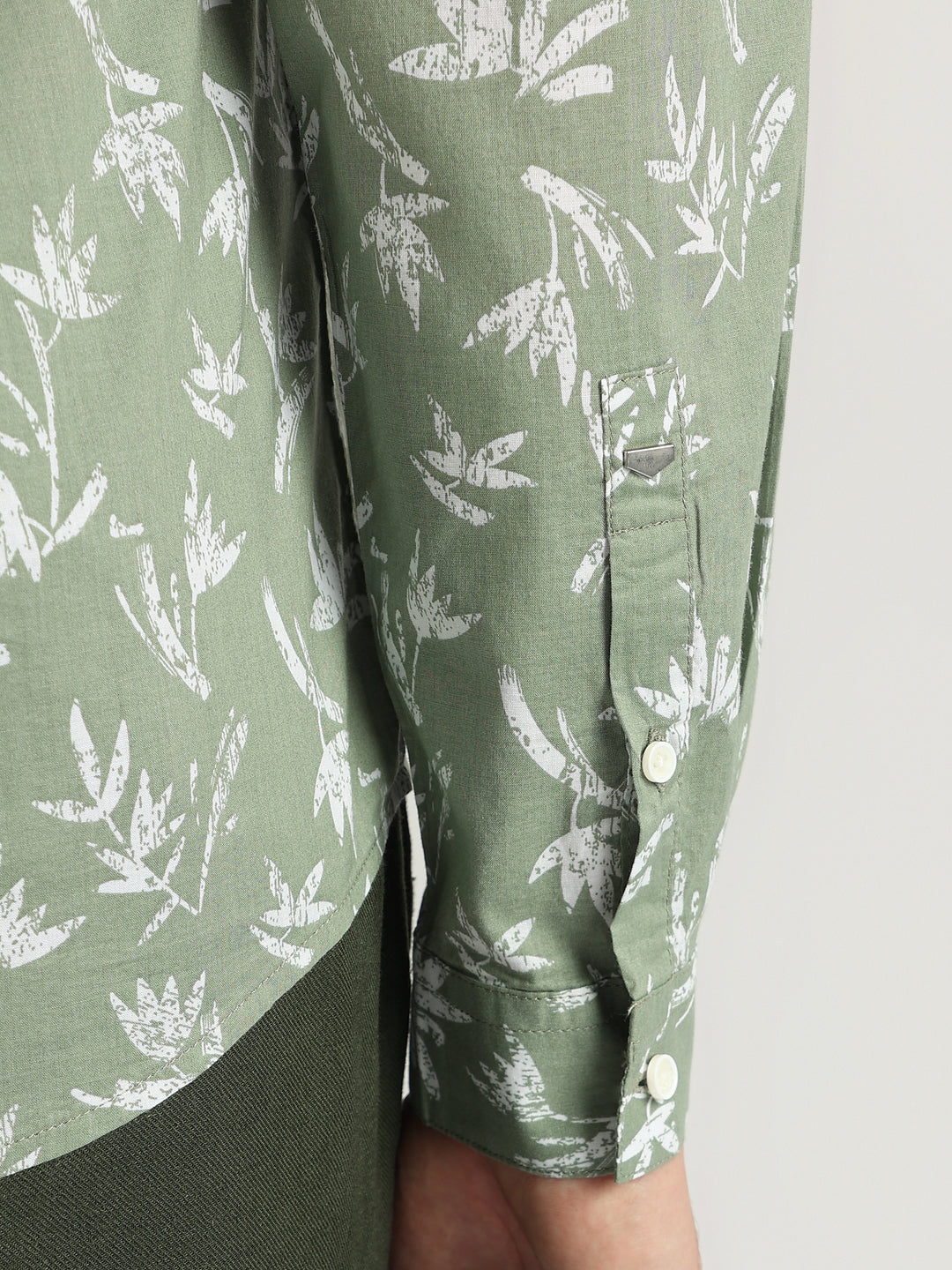 Embrace the vibrant spirit of Dubai with this sleek, green printed shirt. Crafted from pure cotton, its slim fit and band collar exude modern style. Full sleeves and button closure complete the sophisticated look, perfect for any occasion.