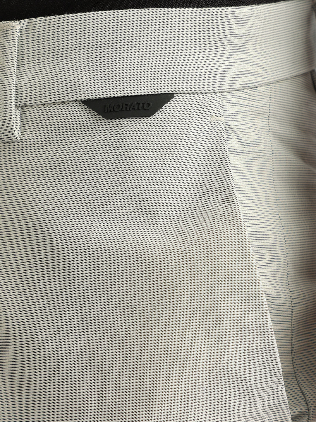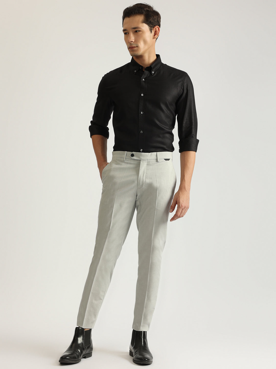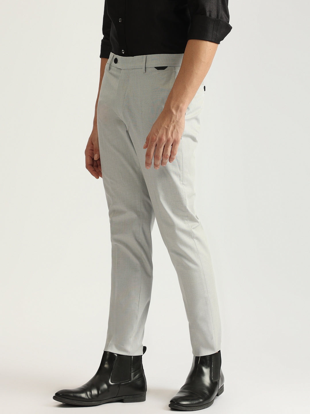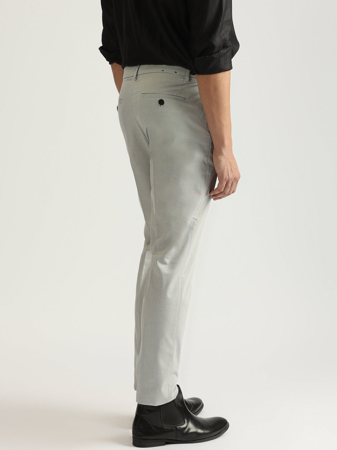 Elevate your style with these sleek, off-white slim-fit trousers. Crafted from a comfortable polycotton blend, they feature a mid-rise waist, button and zip closure, and a timeless solid pattern. Perfect for both casual and smart casual occasions.