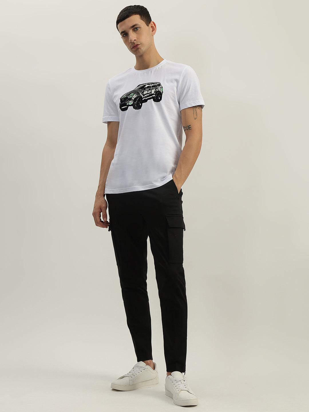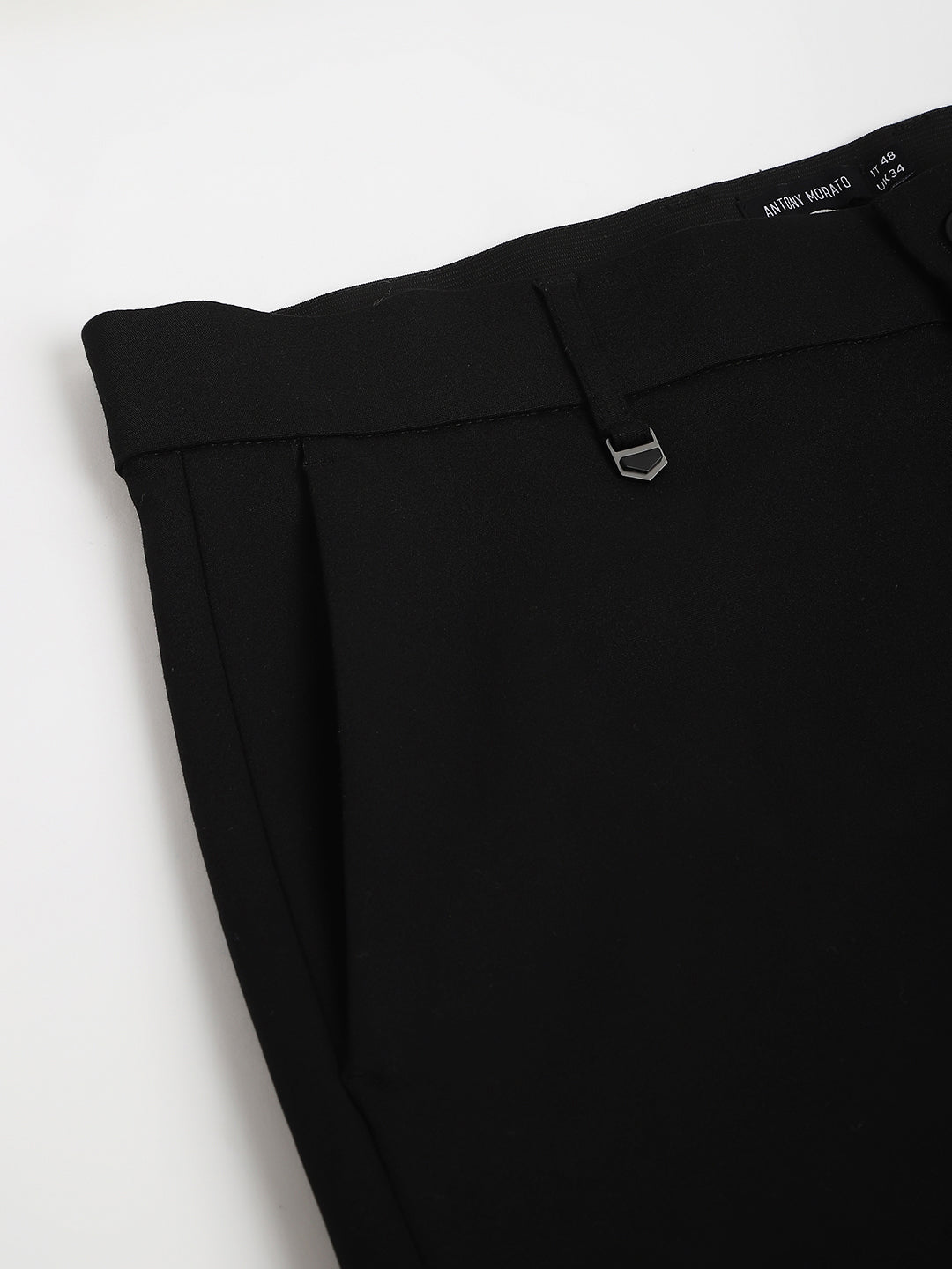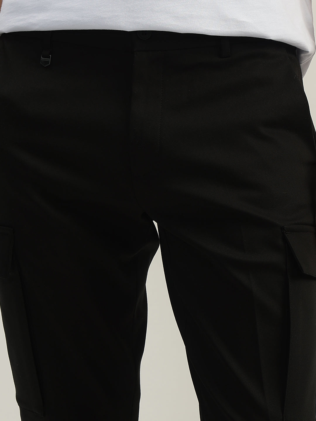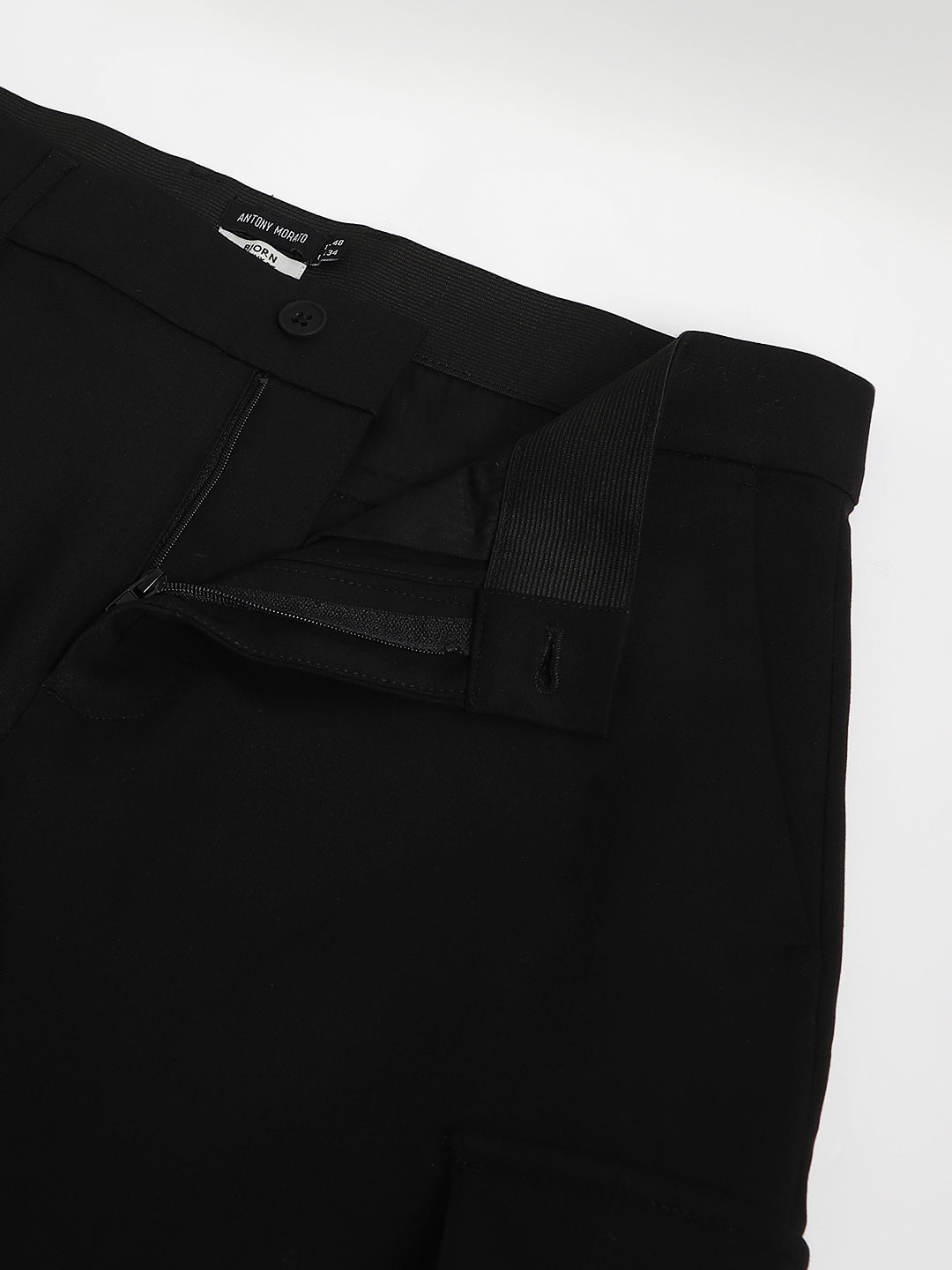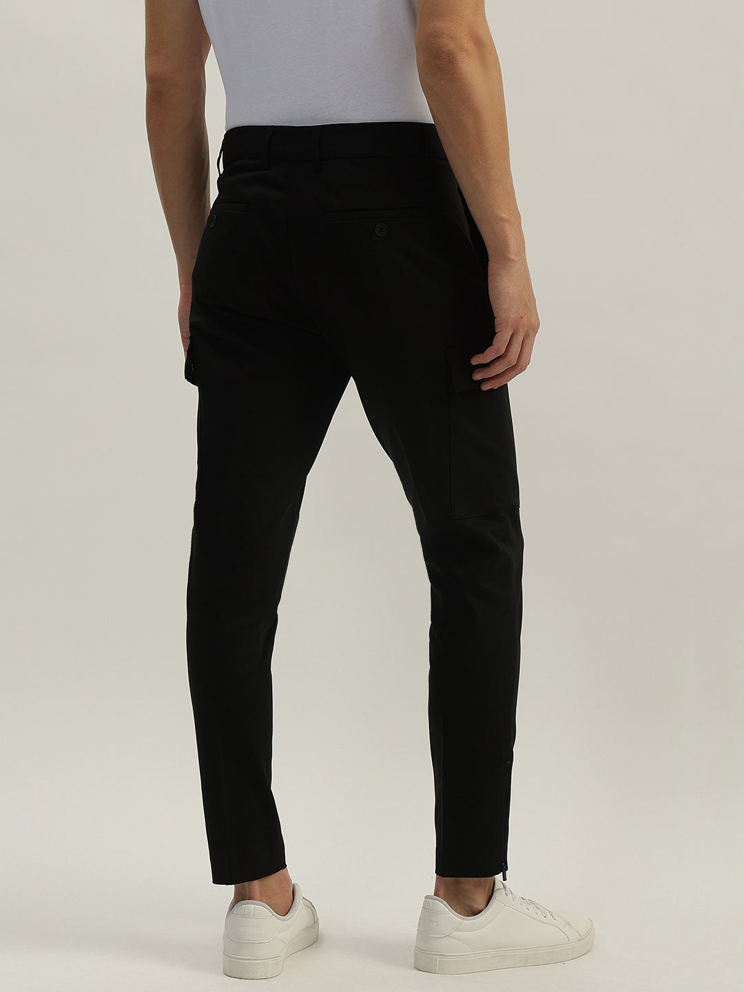 Sleek and stylish, these black cargo trousers offer a skinny fit for a contemporary look. Crafted from a comfortable poly cotton blend, they feature a mid-rise waist, button and zip closure, and functional cargo pockets.