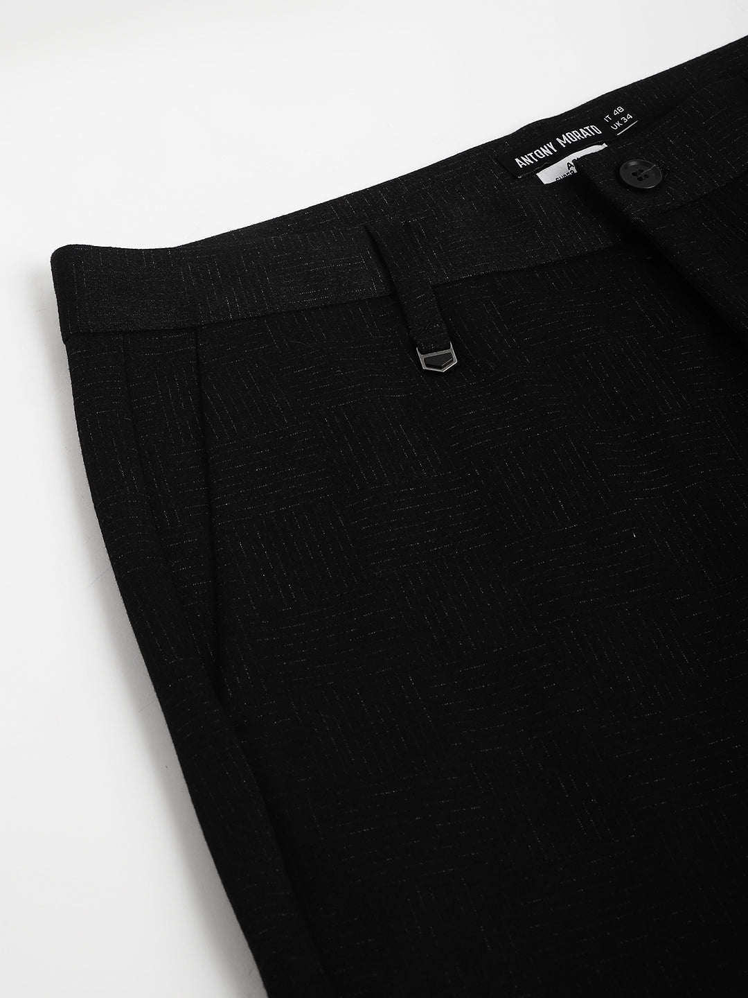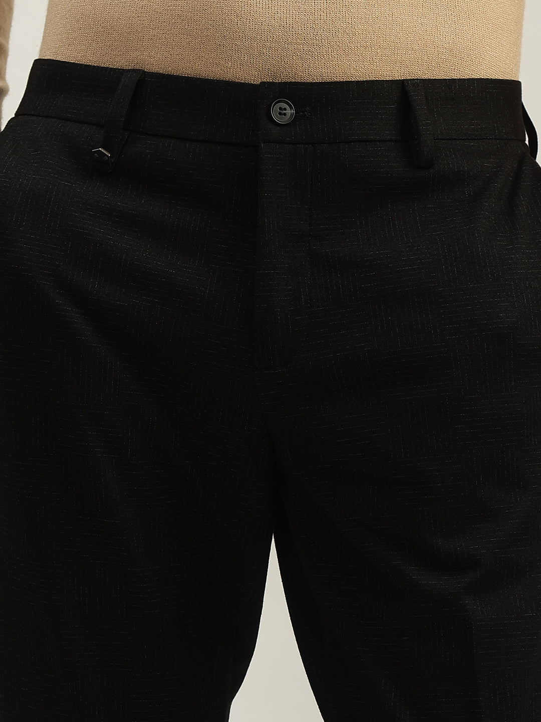 Sleek and sophisticated, these black flat-front trousers offer a super skinny fit for a contemporary look. Crafted from a comfortable polyester blend, they feature a mid-rise waist, button and zip closure, and a solid pattern for versatility.