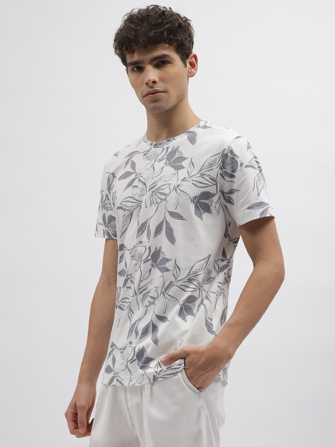 Experience comfort and style with this grey, regular fit t-shirt for men. It features a unique printed pattern, short sleeves, and a classic round neck. Made from soft, breathable cotton fabric, it ensures maximum comfort throughout the day. The easy closure adds to its practicality. Perfect for casual wear or stylish outings.