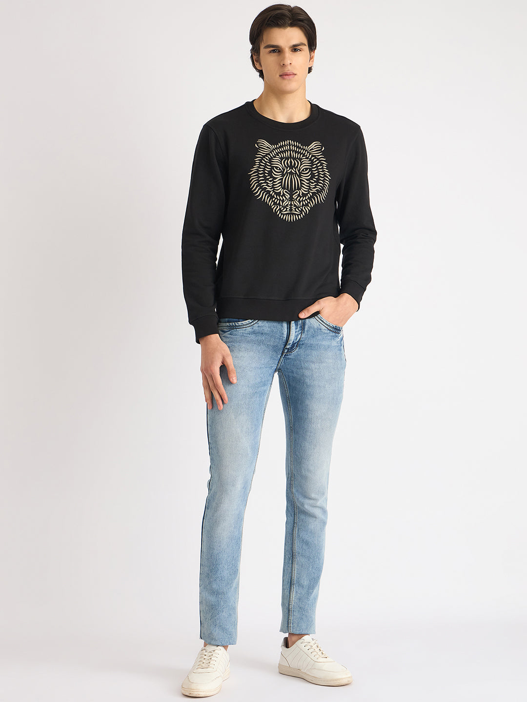 Effortlessly cool, this black poly-cotton sweatshirt boasts a bold printed pattern, a classic round neck, and a comfortable regular fit. Full sleeves and a pull-on closure complete the look.