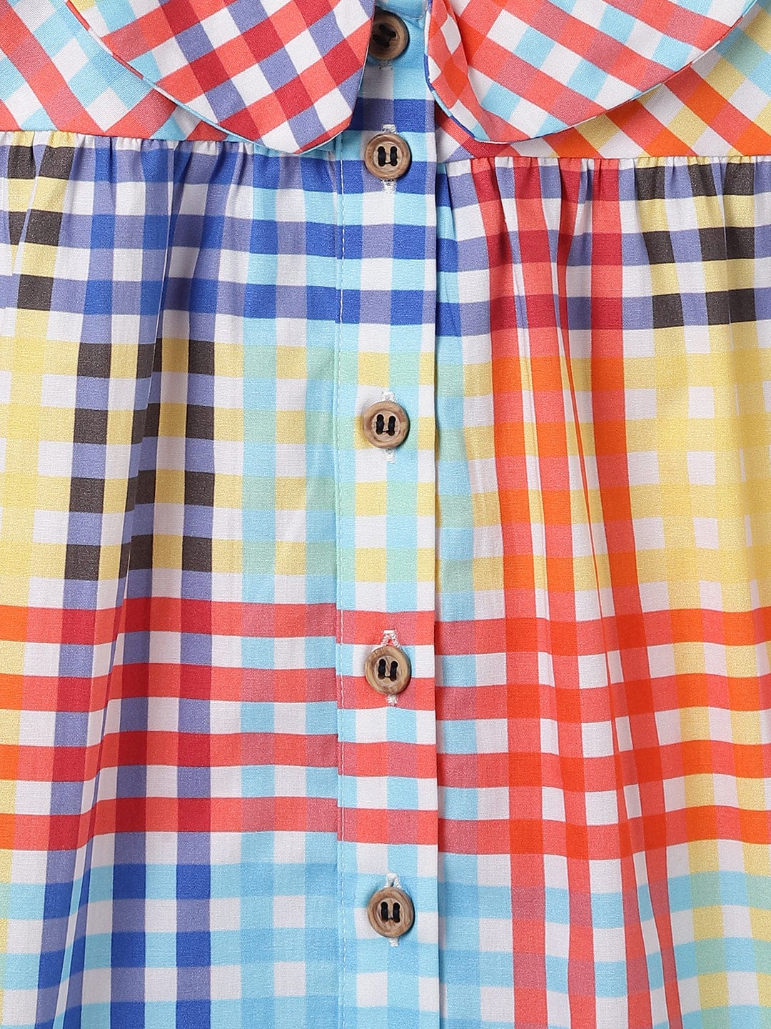 This adorable a-line top is perfect for your little girl it features a classic peter pan collar and ruffle sleeves for a touch of whimsy the plaid checks pattern adds a touch of sophistication while the regular fit ensures a comfortable wear the top is made from pure cotton poplin fabric which is soft and breathable and the button closure makes it easy to put on and take off
