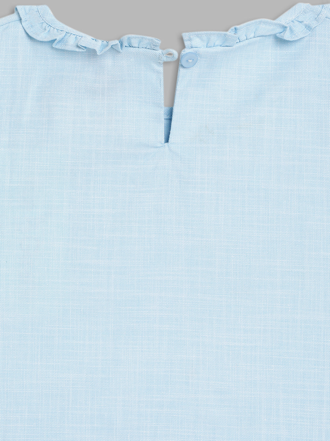 A charming blue top for girls, featuring a flattering fit and flare silhouette. Delicate embroidery adds a touch of elegance. Short sleeves, a round neck, and button closure provide comfort and style. Crafted from soft cotton for all-day wear.