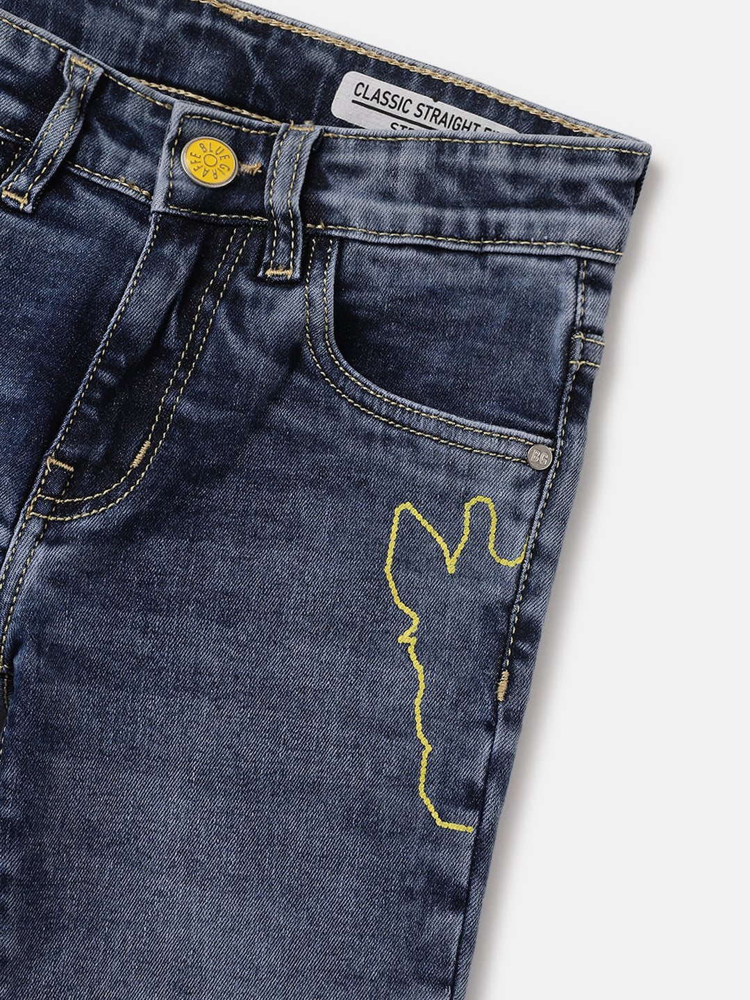 These blue jeans are the perfect blend of style and comfort for boys they feature a straight fit that flatters every body type and a mid rise that sits comfortably on the waist the button and zipper closure ensures a secure fit while the cotton fabric provides all day comfort the printed design adds a touch of personality while the back pocket embroidery adds a touch of sophistication the stretchable fabric allows for maximum movement and flexibility making these jeans perfect for any occasion