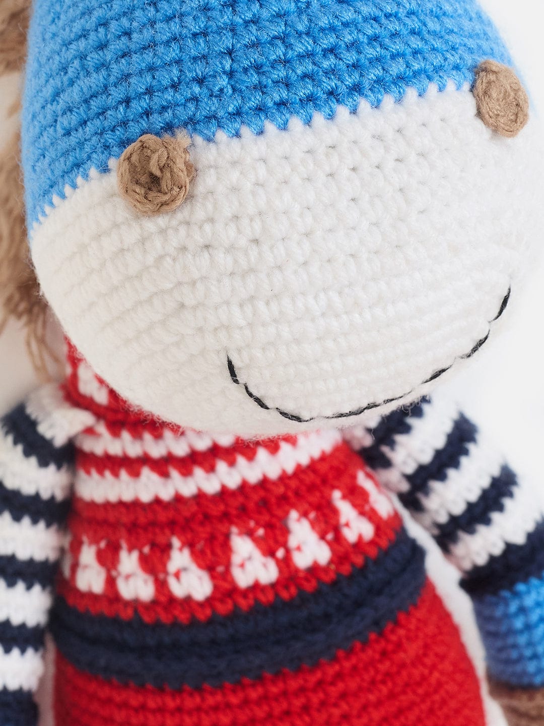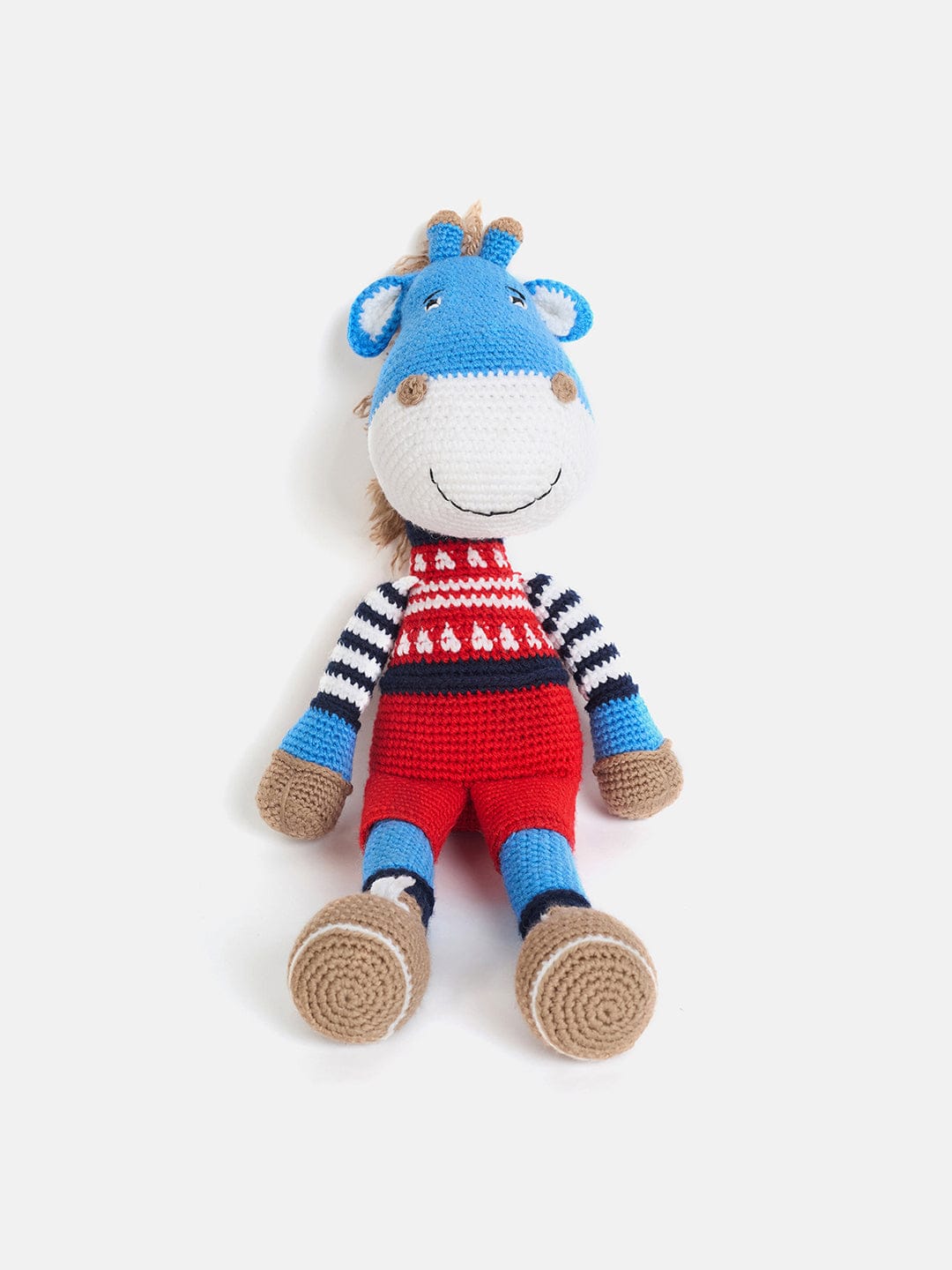 Meet your child's new favourite cuddle buddy! This adorable hand-crocheted blue giraffe toy is lovingly crafted from soft, high-quality yarn for a gentle touch. Featuring a cheerful smile, striped sleeves, and bright red overalls, it adds a pop of color and joy to any nursery. Perfect for playtime or naptime snuggles, this plush companion is both durable and safe for all ages. A charming gift idea for birthdays or baby showers!