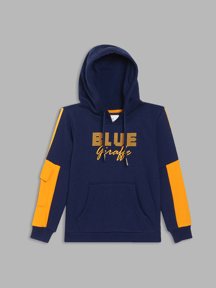 Blue Giraffe Boys Blue Color-Blocked Hooded Full Sleeves Pullover Style Sweatshirt