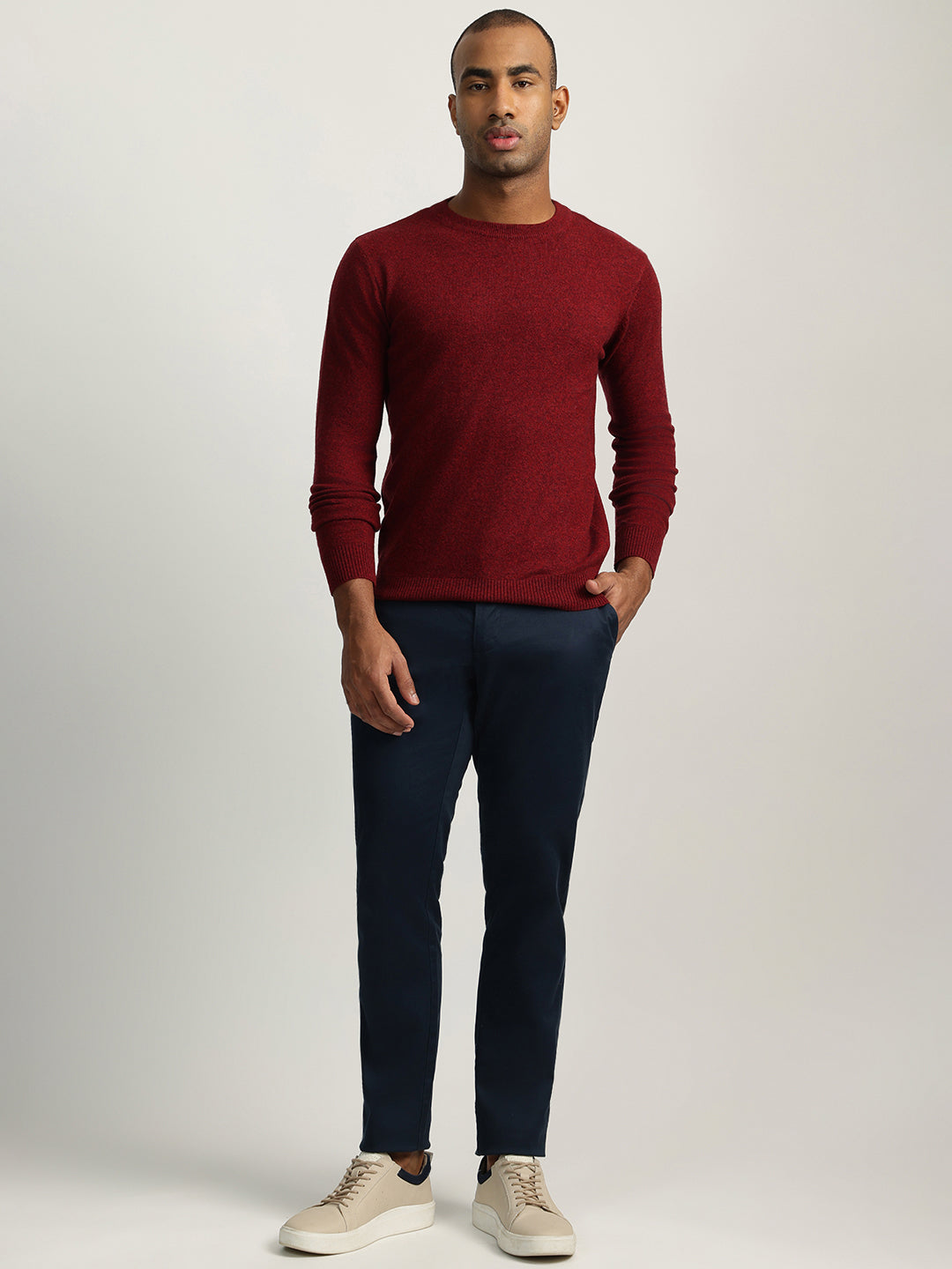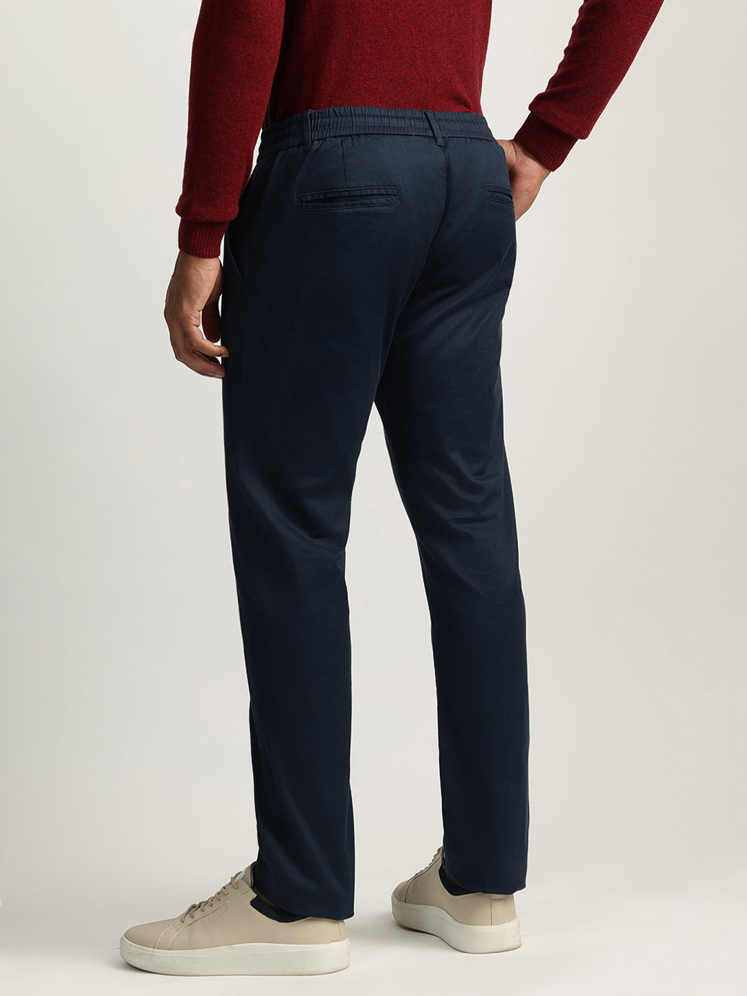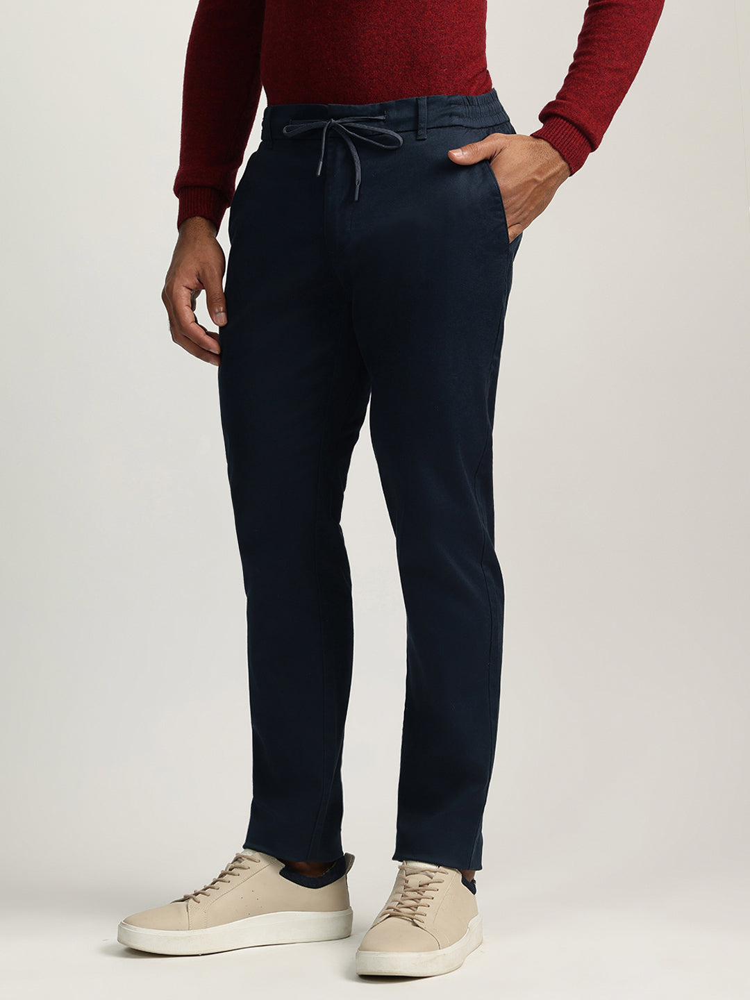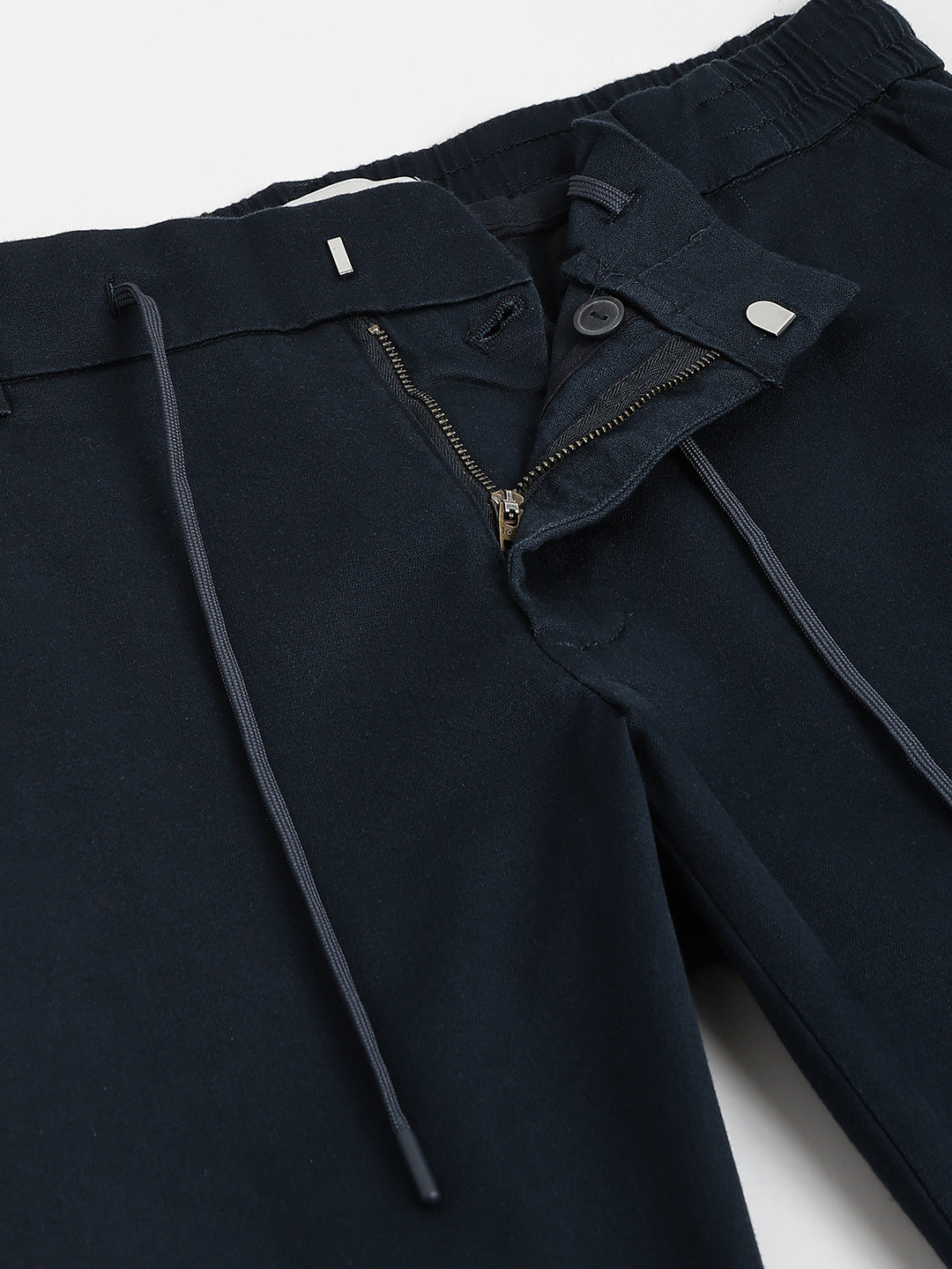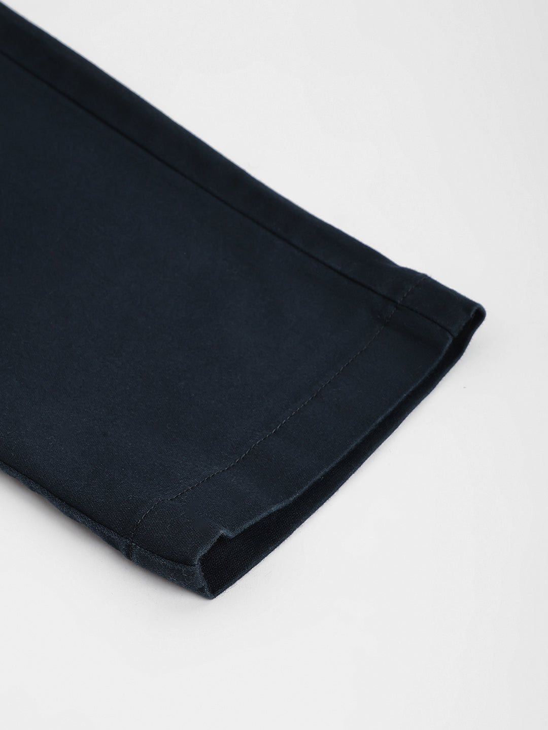 Elevate your style with these classic flat-front trousers. Crafted from a comfortable cotton blend, they feature a regular fit, mid-rise waist, and a button and zip closure. The solid blue hue adds a touch of sophistication, making them perfect for both casual and smart casual occasions.