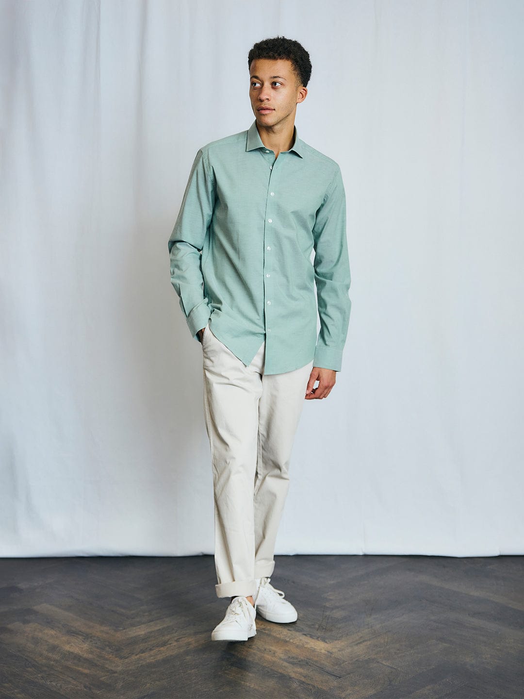 Elevate your style with this green slim-fit shirt, crafted from premium cotton for ultimate comfort. Featuring a solid pattern, full sleeves, and a classic spread collar, it offers a sleek, modern look. The button closure ensures a perfect fit, making it an essential addition to any man's wardrobe.