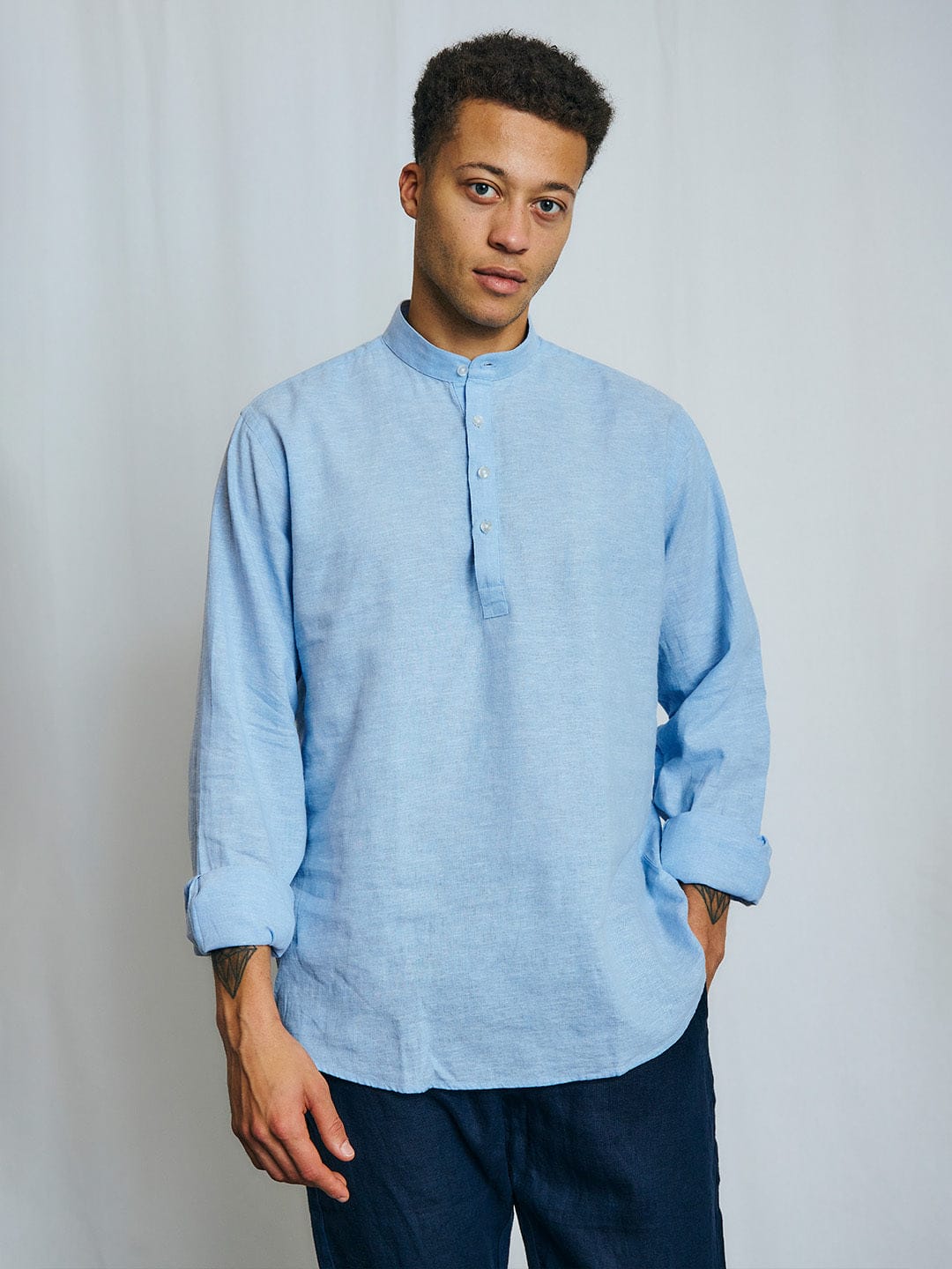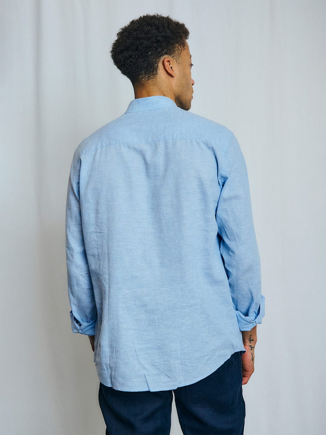 Elevate your wardrobe with this stylish blue shirt, featuring a casual modern fit and solid pattern. Crafted from a premium linen blend, it offers comfort and breathability. The full sleeves and mandarin collar add a contemporary touch, while the button closure ensures a polished look. Perfect for any occasion.