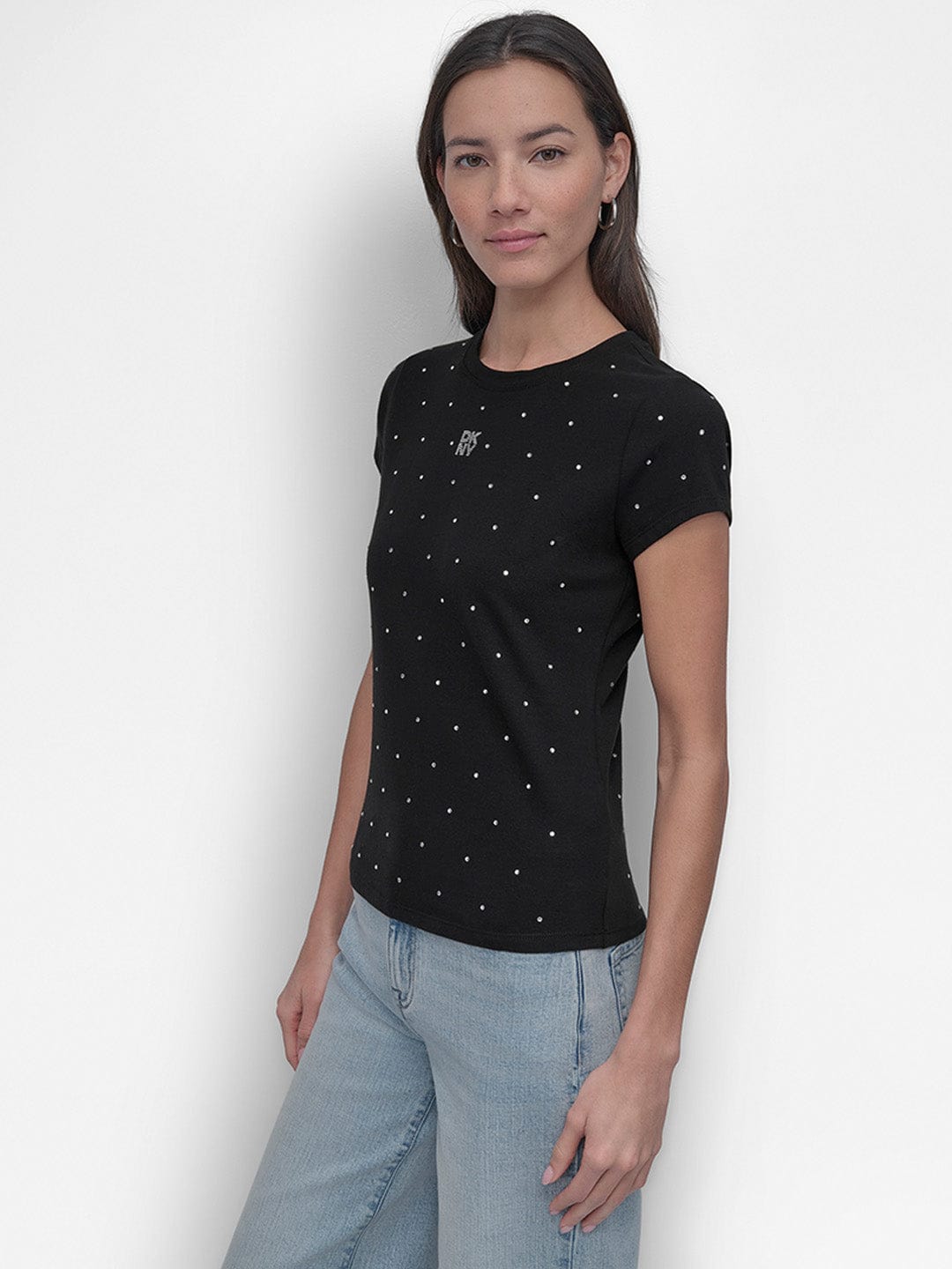 Discover the perfect blend of style and comfort with our women's black t-shirt. Designed in a regular fit, this embellished pattern tee offers a chic look that's ideal for any casual outing. The short sleeves and round neck provide a classic silhouette, while the cotton blend fabric ensures breathability and softness against your skin. With its pull-on closure, this t-shirt is easy to wear and versatile for layering. Plus, the stretchable material allows for unrestricted movement, making it a must-have staple in your wardrobe. Elevate your everyday ensemble with this effortlessly stylish piece.