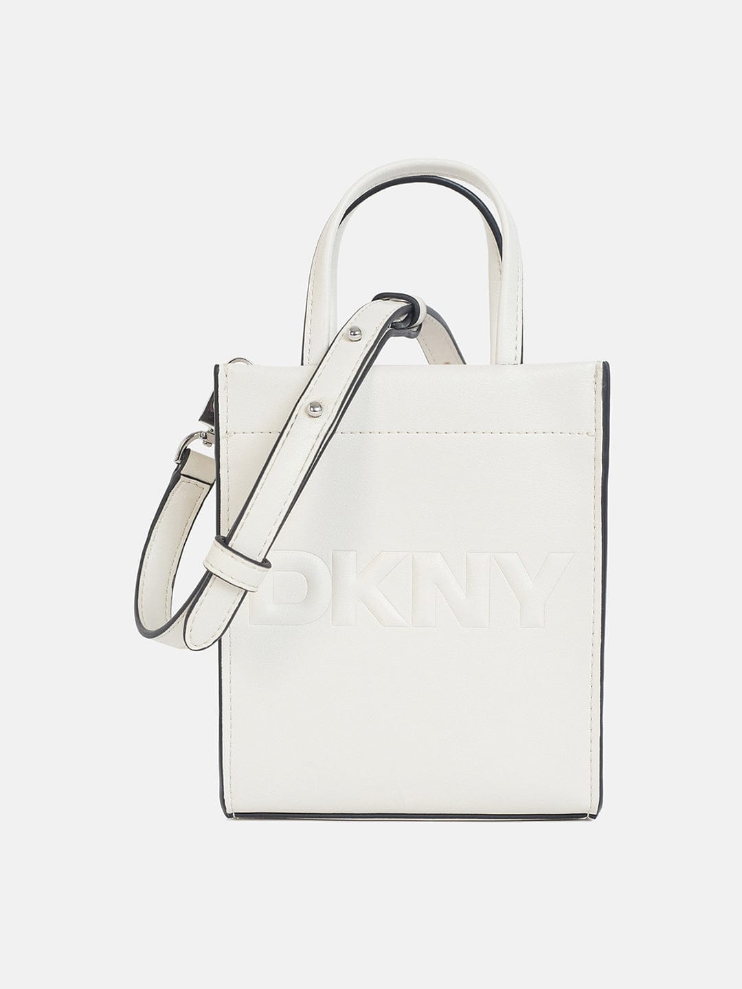 Elevate your everyday style with this sleek DKNY mini tote bag in classic white. Crafted from premium faux leather, it features a minimalist silhouette with bold embossed branding for a modern edge. The structured design includes dual top handles and a detachable crossbody strap for versatile wear. Perfectly sized for essentials, this compact yet chic bag is ideal for on-the-go elegance—whether you're heading to brunch or a night out. A must-have accessory for the fashion-forward.