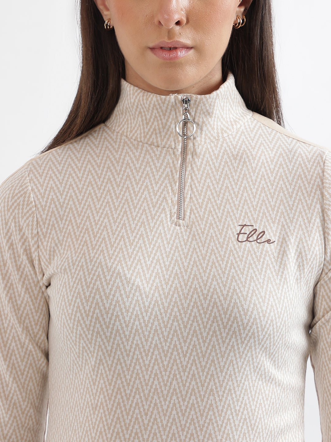 Embrace elegance in this beige bodycon dress. Featuring a flattering fitted silhouette, full sleeves, and a high neck, this printed dress is crafted from comfortable polyester. The zip closure ensures a secure fit.