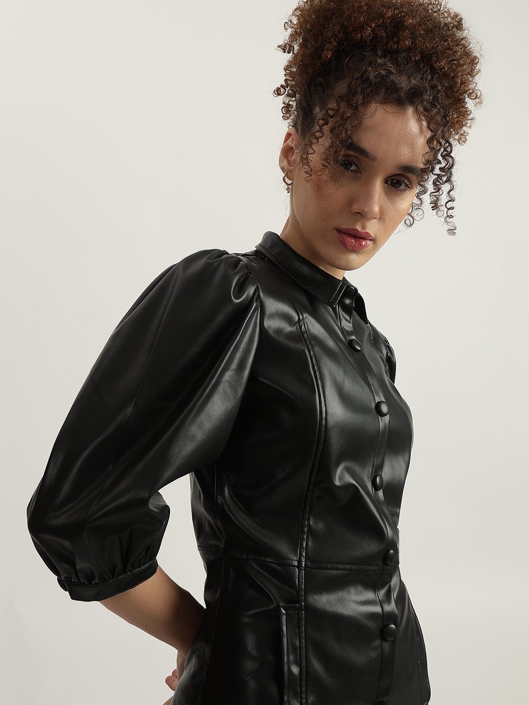 Effortlessly chic, this black bodycon dress features a flattering fit, 3/4 sleeves, a spread collar, and button closure. Crafted from comfortable polyester, it's perfect for any occasion.