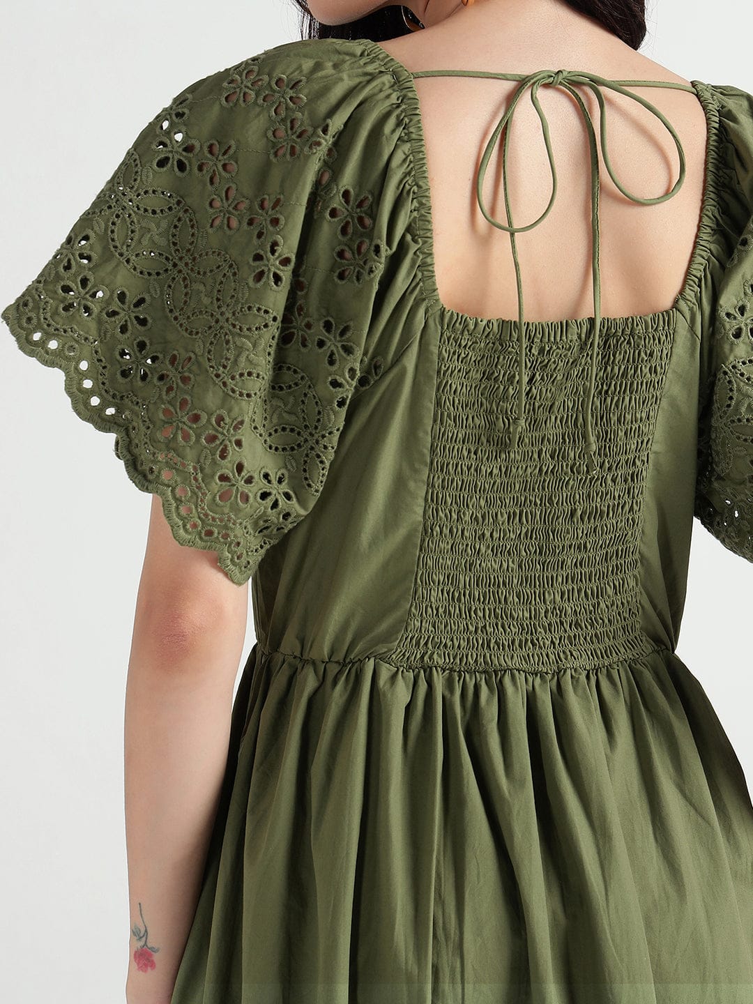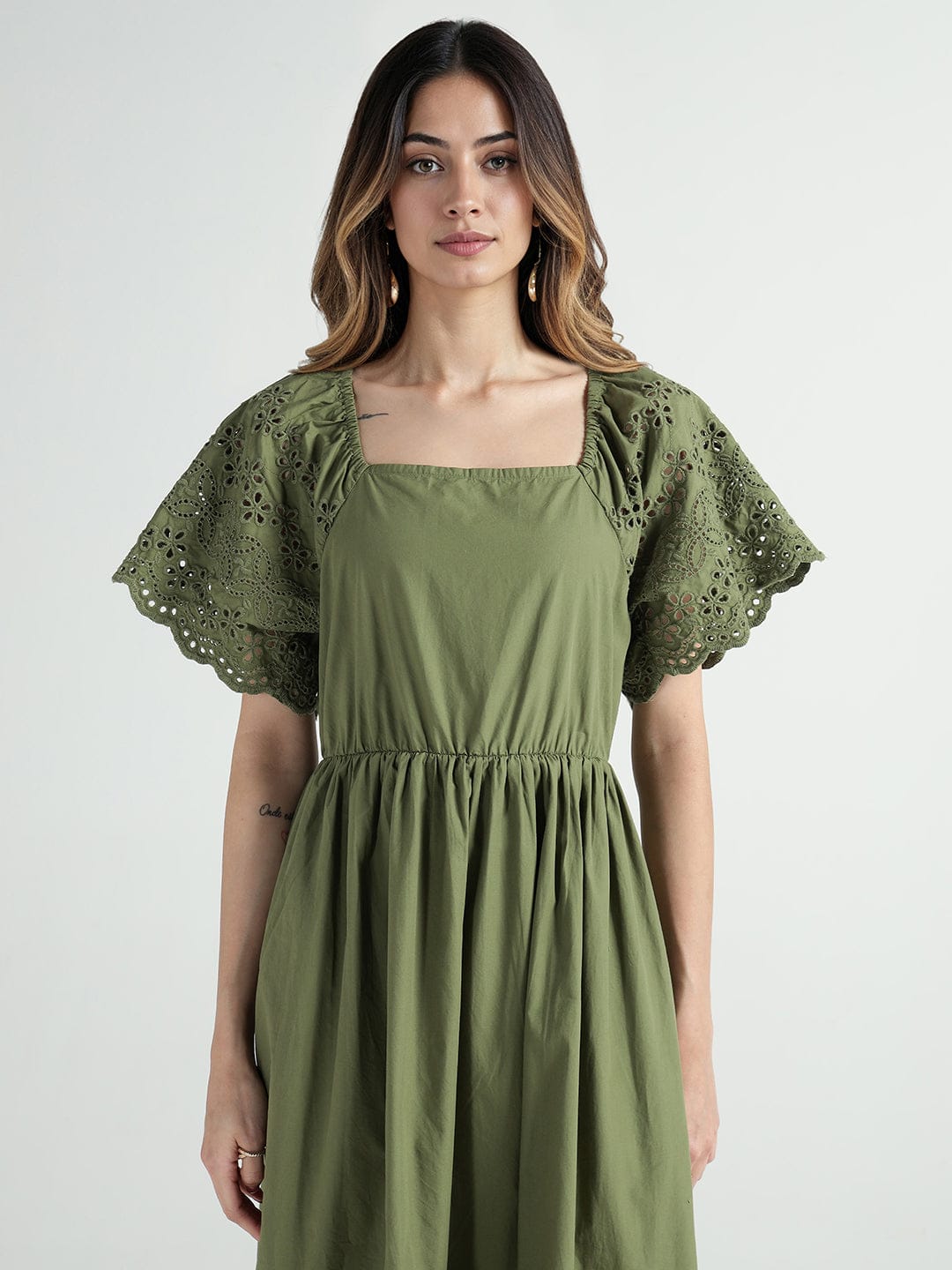 The v-neckline & half sleeves make this dress easy to wear for casual outings. Made up of cotton fabric gives it light breathable feel. Smocking at the waist adds shape while keeping it comfortable. Calf length with a side zipper makes it practical and simple to carry. Solid olive tone follows the seasonal fashion trend.