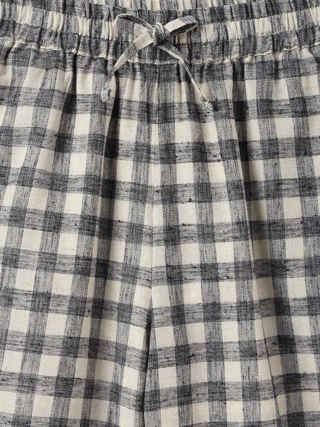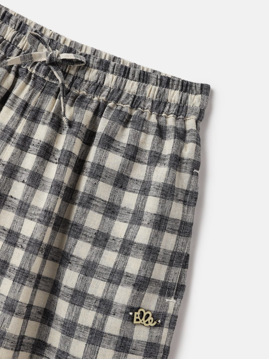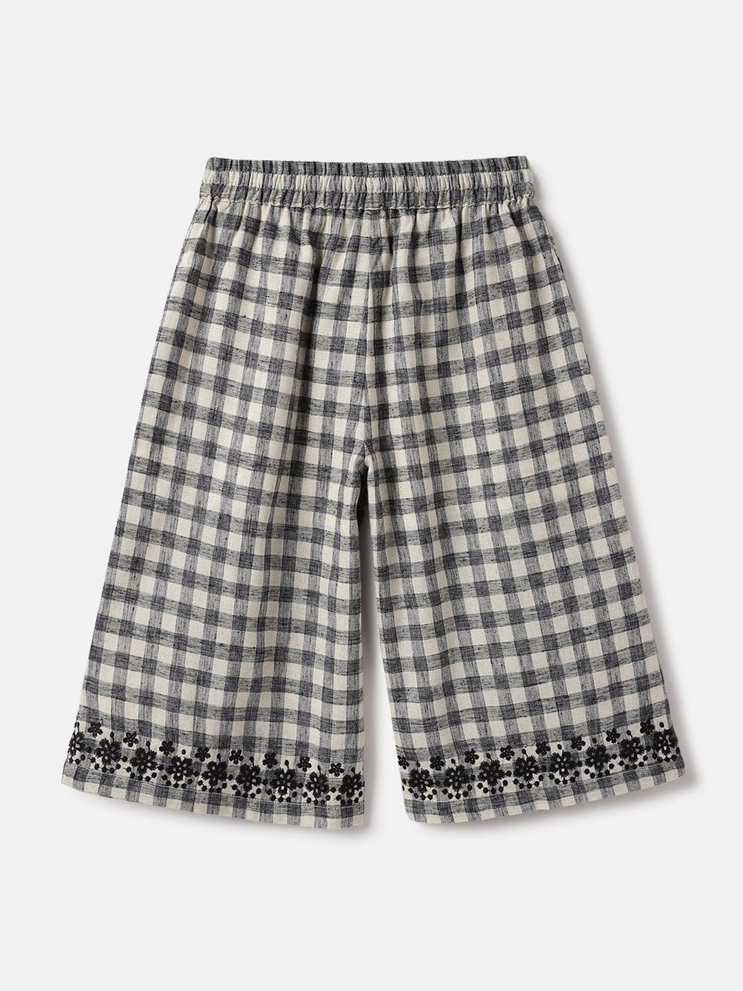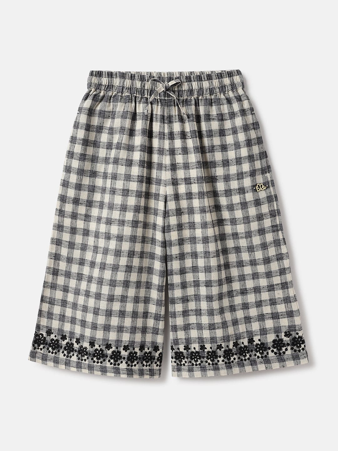 Embrace effortless style with these beige wide leg culottes. Crafted from soft polyester fabric the checks pattern adds a touch of playful charm. The mid rise waist sits comfortably and the drawstring closure allows for a personalized fit. The embroidered details add a touch of elegance. Perfect for casual days or dressed up occasions these culottes are a versatile addition to any girl's wardrobe.