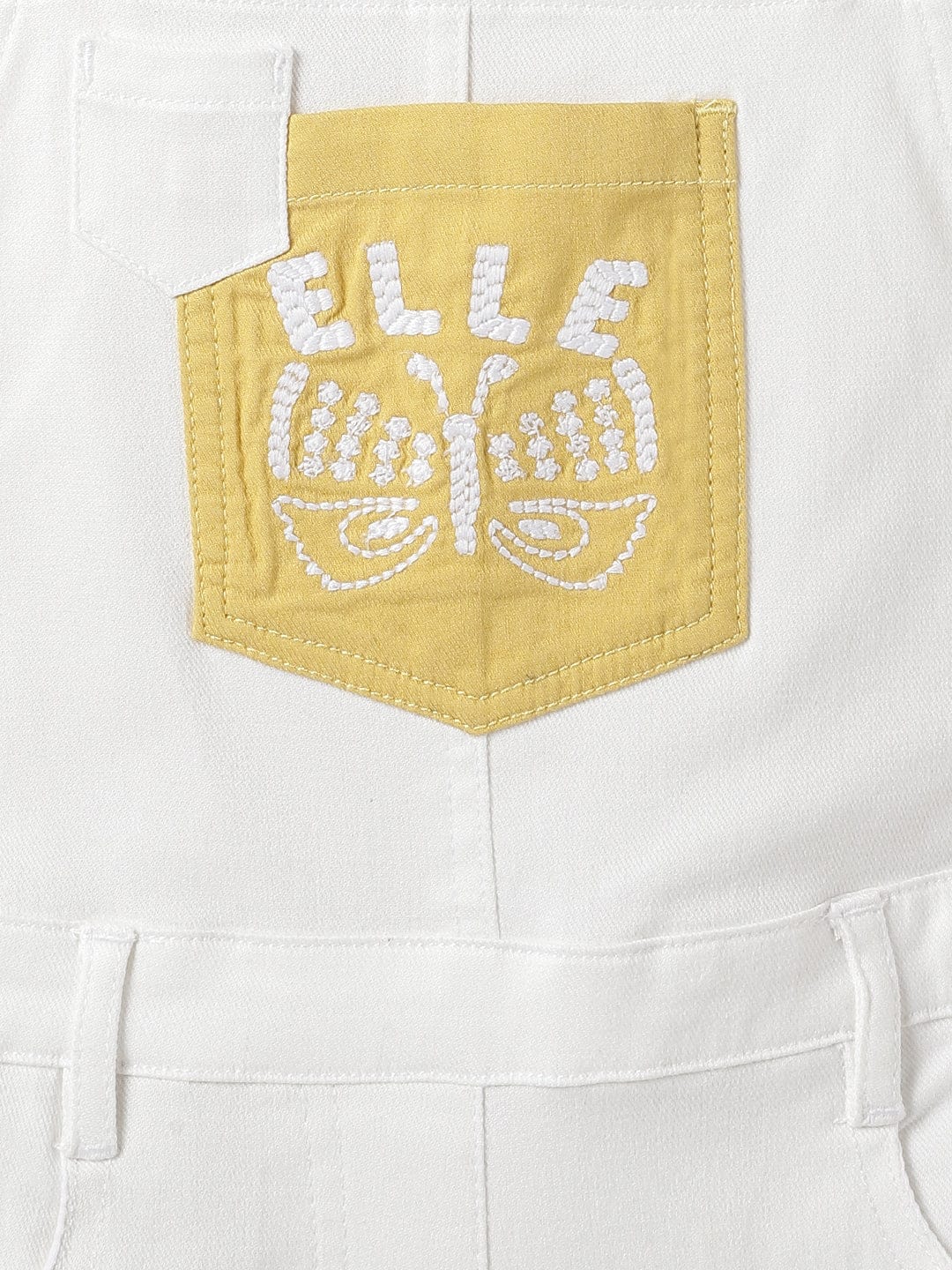 This white jumpsuit is perfect for your little girl It features a relaxed fit and a sleeveless square neck for ultimate comfort The pure cotton fabric is soft and breathable while the button closure makes it easy to put on and take off The stretchable color blocked dungree adds a touch of style and the embroidered branding note makes it extra special.