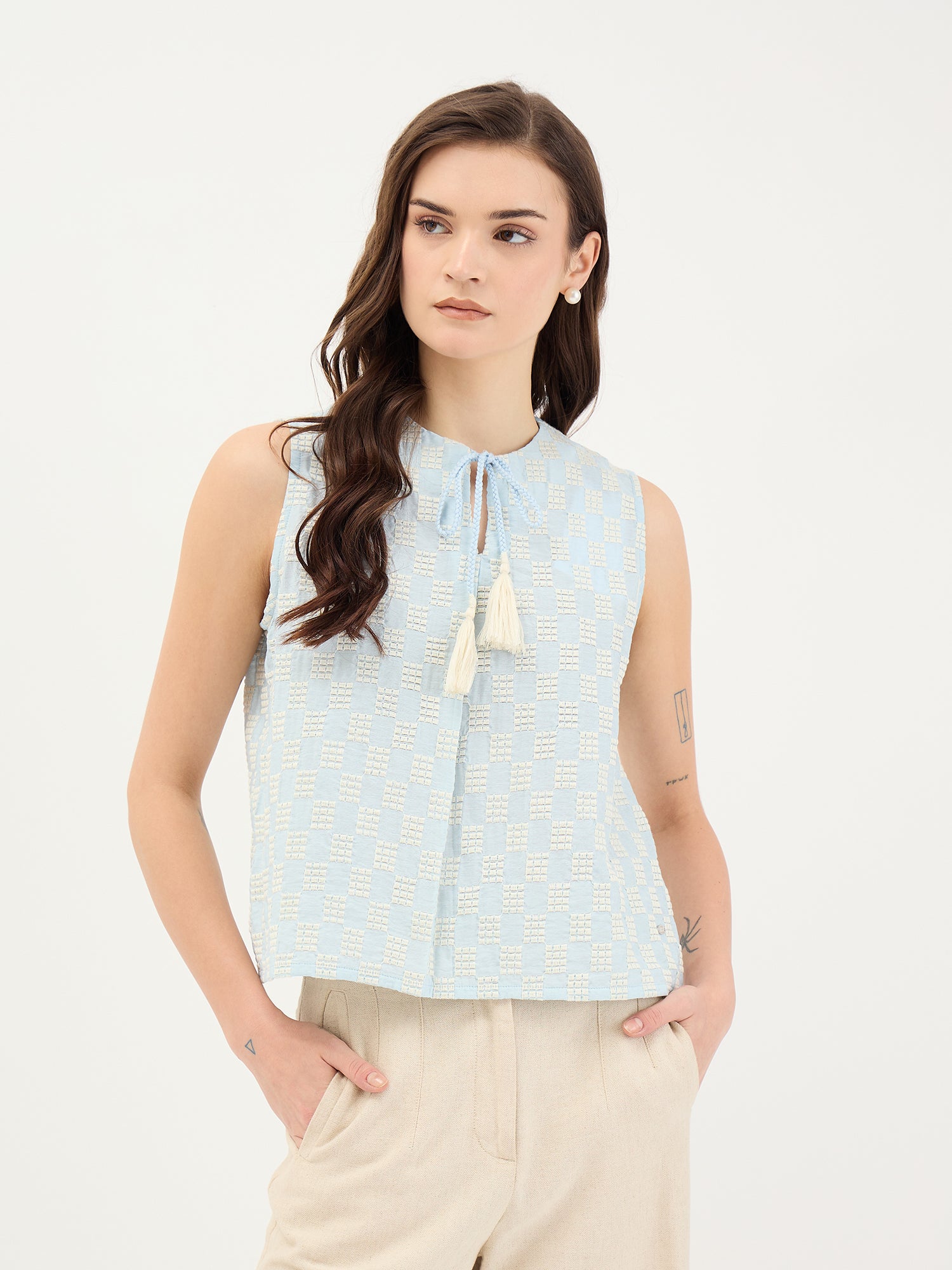 Discover effortless style with our blue sleeveless top, featuring a relaxed embroidered pattern that adds a touch of elegance to your wardrobe. Crafted from high-quality polyester fabric, this top ensures comfort and durability for all-day wear. The tie-ups neck and closure offer a customizable fit, allowing you to adjust the neckline to your preference. Perfect for casual outings or a day at the office, this versatile piece pairs beautifully with jeans or skirts. Elevate your fashion game with this chic and timeless addition to your collection.