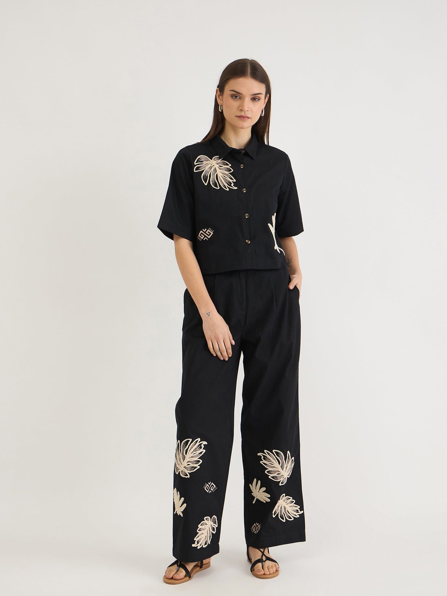 Embrace timeless elegance with these black straight-fit trousers. Crafted from pure cotton, they offer comfort and breathability. The mid-rise waist ensures a flattering fit, while the button and zipper closure provide a secure and polished look. The intricate dori embroidery adds a touch of artistry, making these trousers a statement piece for any occasion.