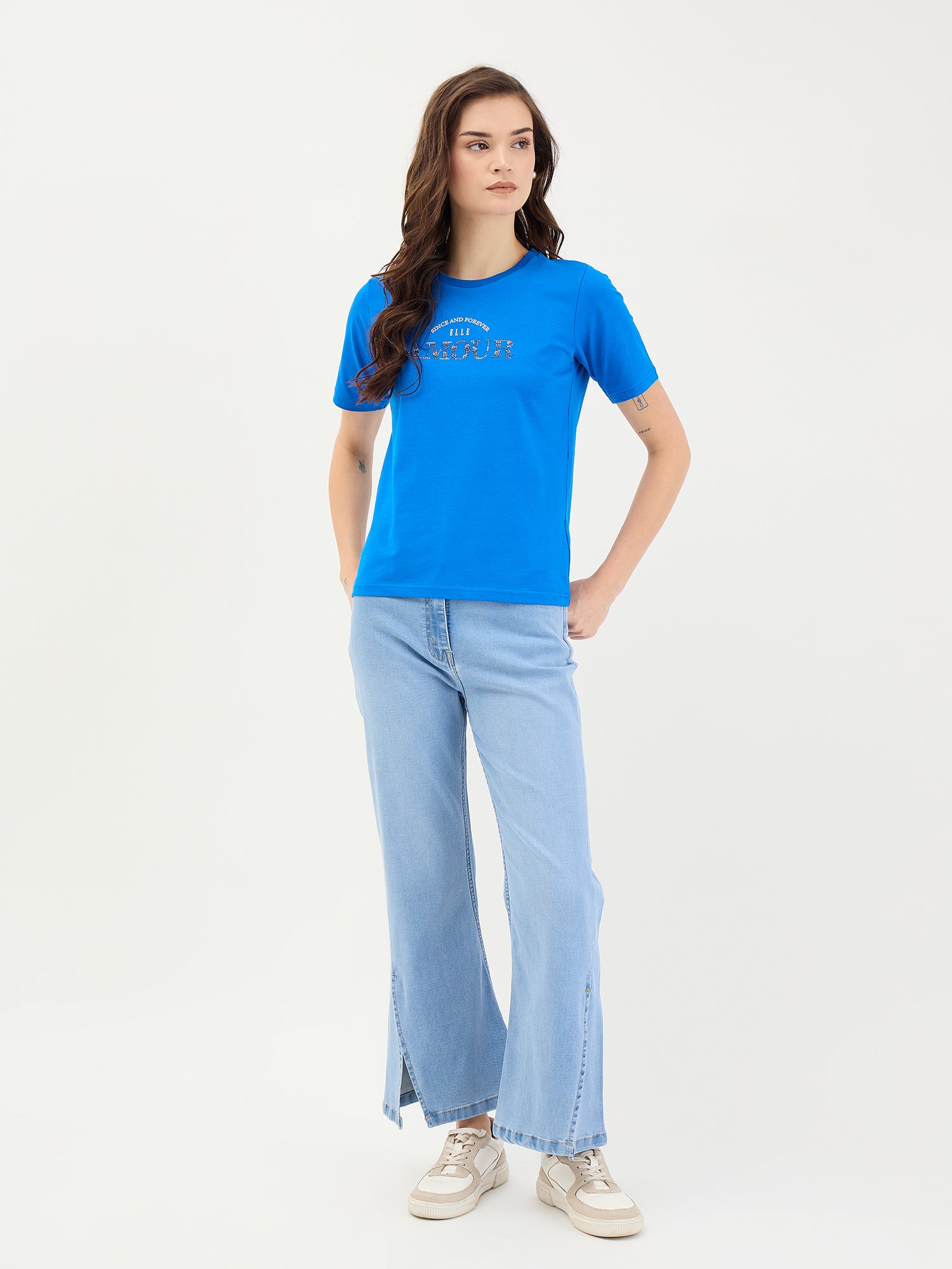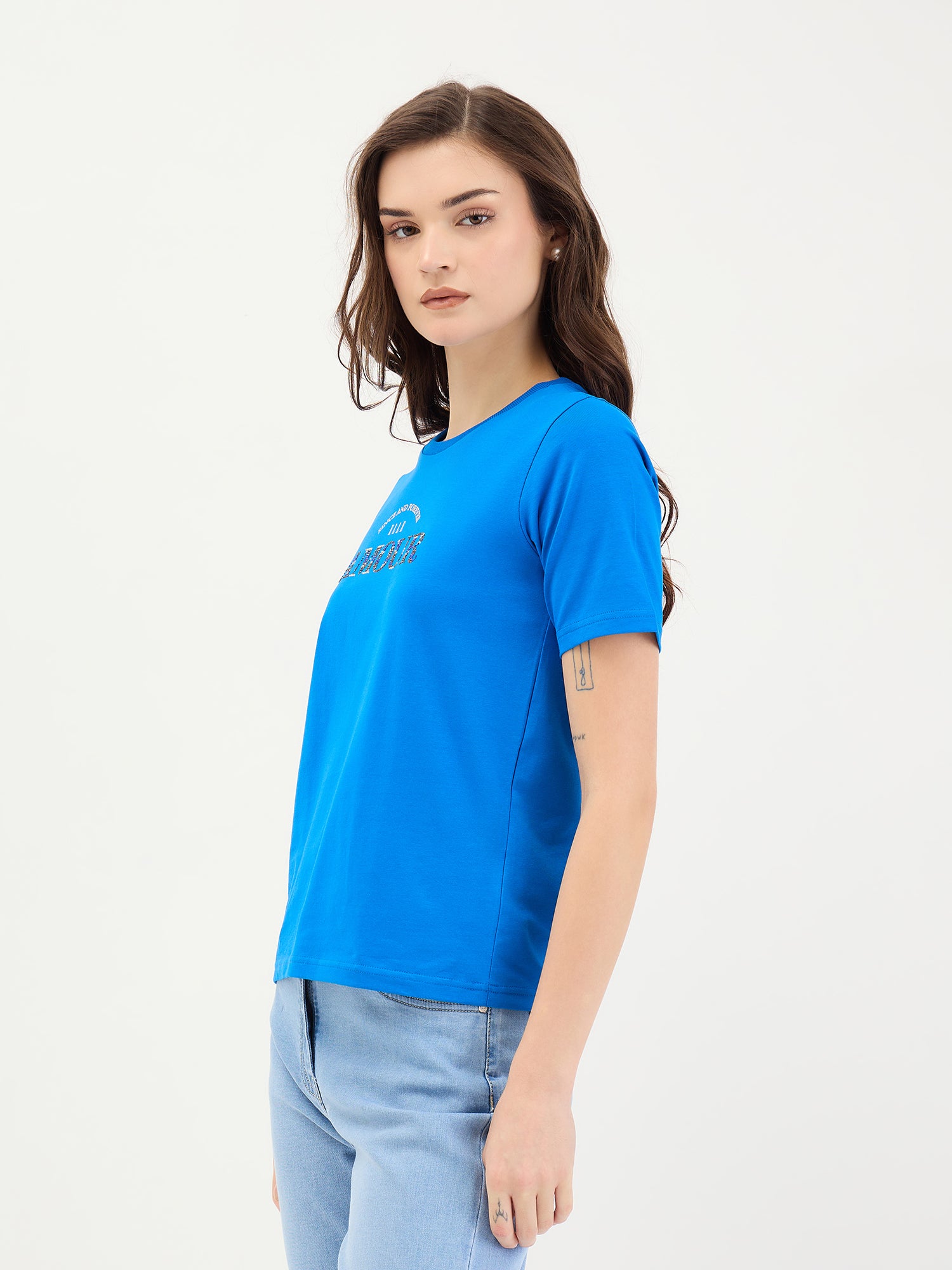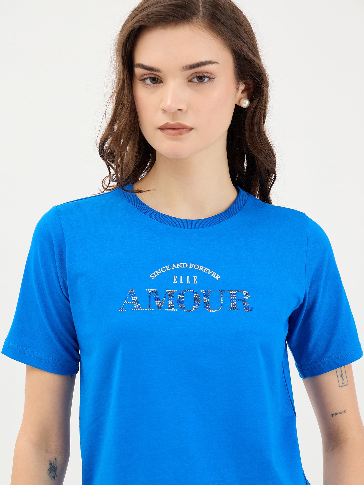 Discover the perfect blend of comfort and style with our women's blue t-shirt. Featuring a relaxed typography pattern, this short sleeve tee is designed with a classic crew neck and crafted from pure cotton fabric for ultimate softness and breathability. The pull-on closure ensures easy wear, while the stretchable crystal branding adds a touch of sparkle and sophistication. Ideal for casual outings or lounging at home, this versatile t-shirt effortlessly combines fashion and function, making it a must-have in your wardrobe.