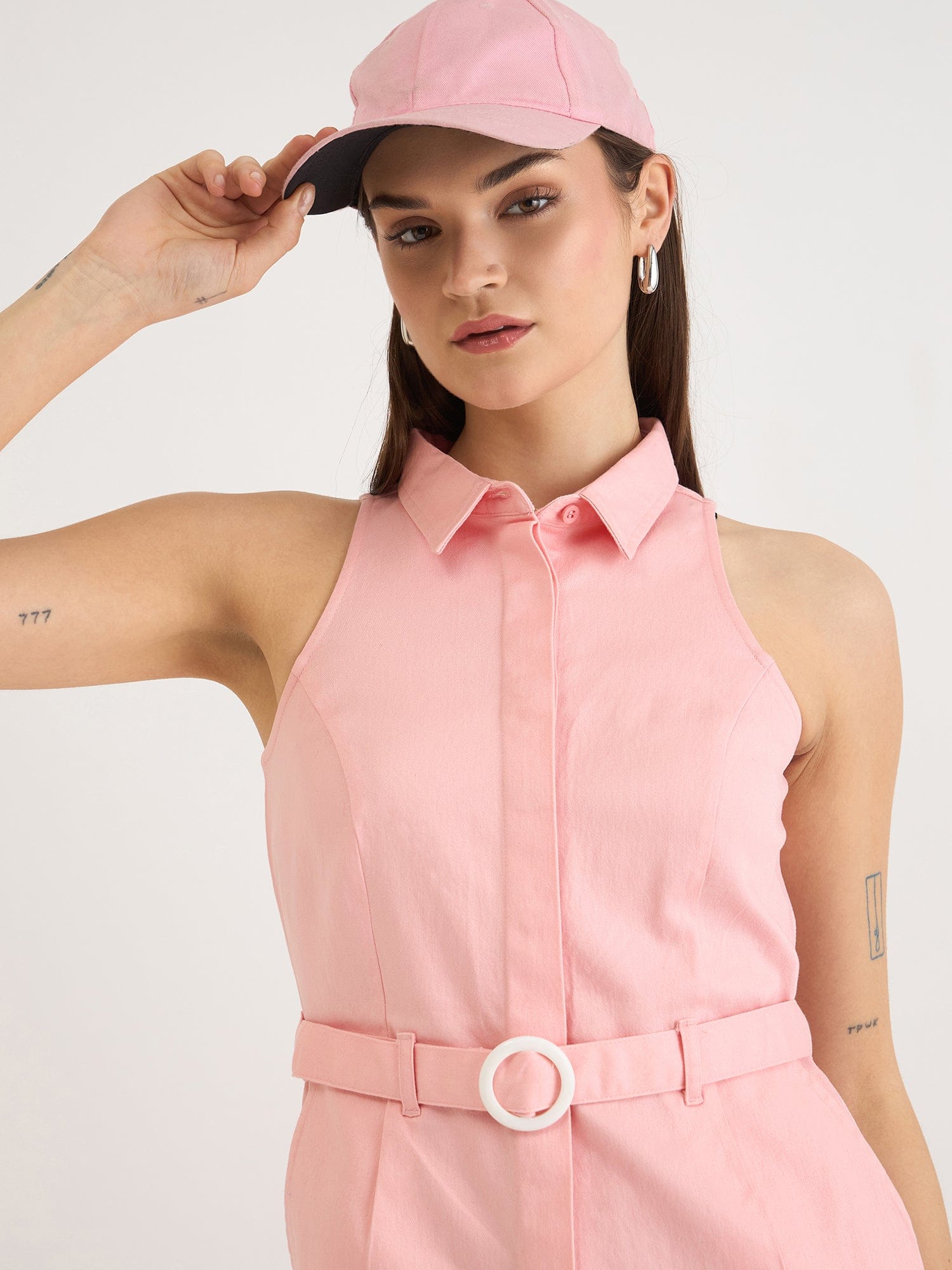This sleeveless belted playsuit is perfect for a relaxed and stylish look. It features a shirt collar with a stretchable neckline for a comfortable fit. The solid pink color and relaxed fit make it a versatile piece that can be dressed up or down. Made from pure cotton, it is soft and breathable. The button closure adds a touch of elegance.