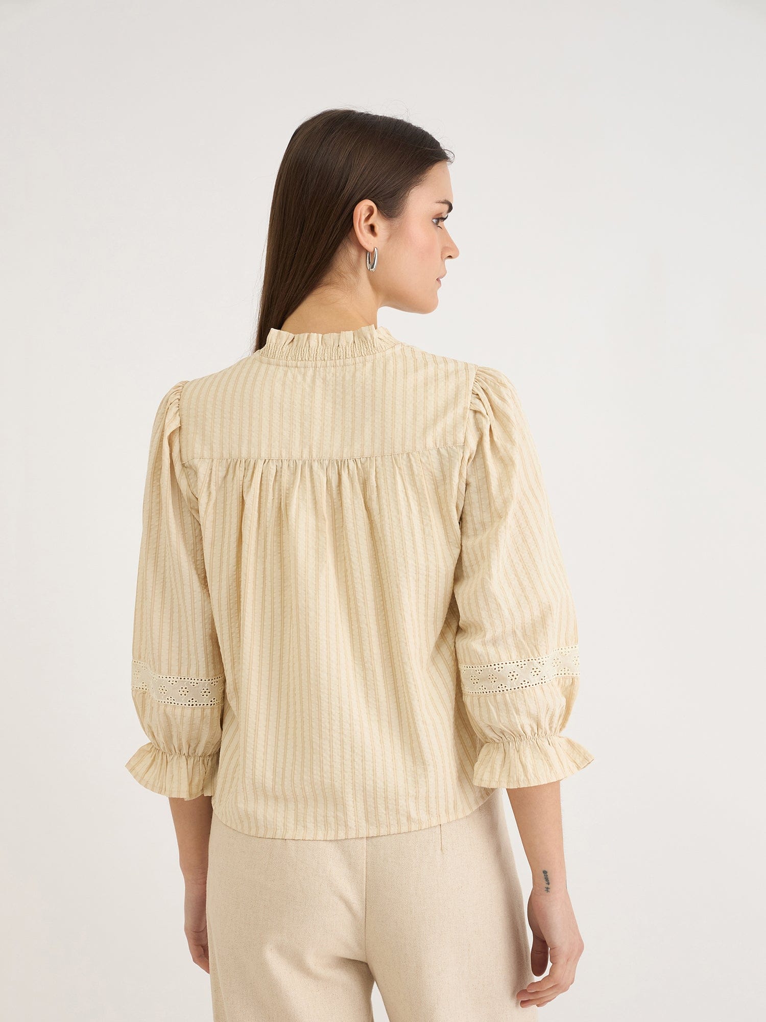 This beige shirt style top is perfect for a relaxed and stylish look. It features a vertical striped pattern and a flattering v-neckline. The 3/4th sleeves provide a comfortable and chic touch. Made from polyester fabric, this top is easy to care for and wrinkle-resistant. The button closure adds a classic detail. The smocking detail at the neckline adds a touch of elegance and helps to create a flattering fit.