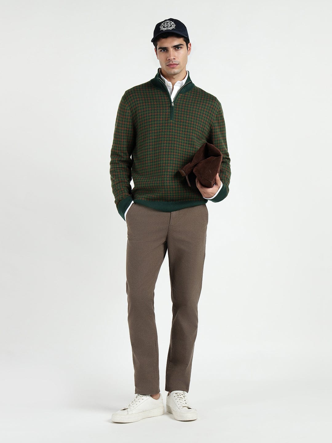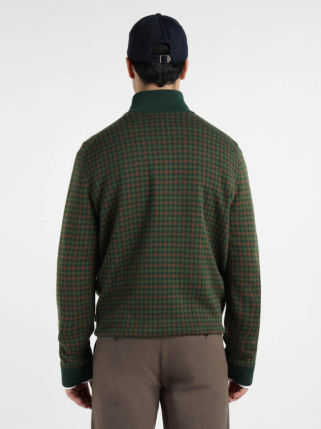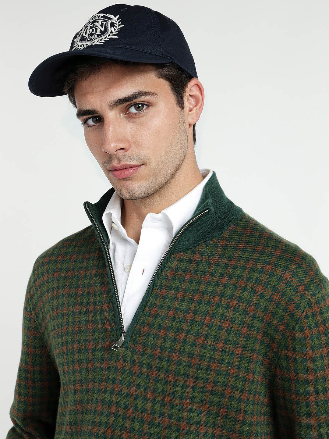 This GANT Men Dark Green Cotton knitted Mock neck sweater. Crafted from soft cotton. This sweater features a classic check pattern and a mock neck design for a sophisticated touch. The regular fit ensures a comfortable and flattering silhouette, while the long sleeves provide warmth on chilly days. Perfect for both casual and dressy occasions. This versatile sweater is a must-have addition to any man's closet. Stay stylish and cozy all season long with this timeless piece from GANT.