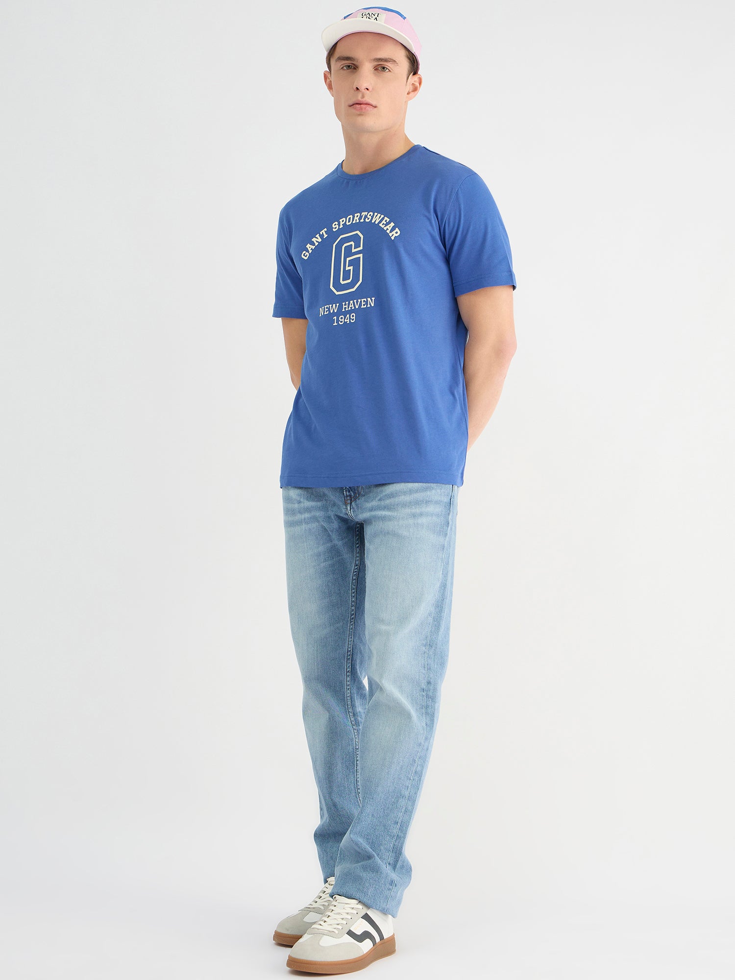 A classic, cool blue tee for everyday wear. Made from soft, breathable cotton, this regular fit shirt features a unique printed pattern that adds a touch of personality. The short sleeves and round neck offer comfort and style, while the pull-on closure makes it easy to slip on and off.
