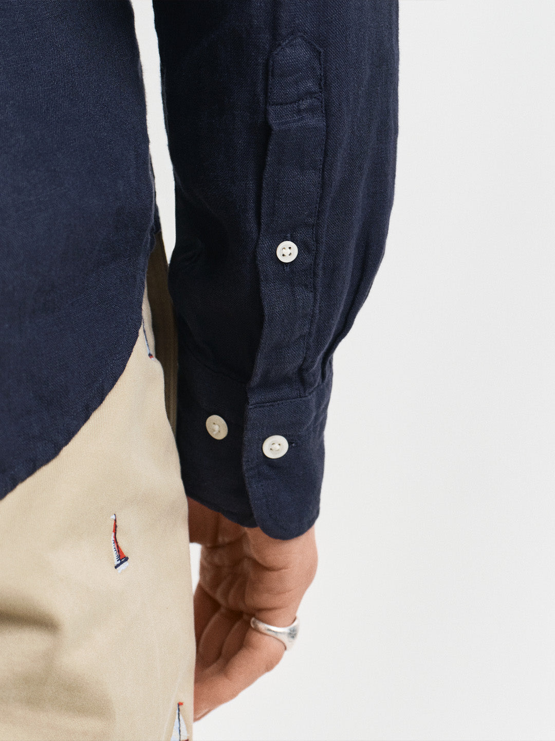 Elevate your wardrobe with our GANT Men Navy Blue Pure Linen Shirt. Crafted from premium linen, this shirt offers unbeatable comfort and breathability, perfect for all-day wear. The timeless navy blue color adds a touch of sophistication to any outfit, while the classic design ensures versatility for both casual and formal occasions. Stay cool and stylish in this must-have wardrobe staple that effortlessly combines quality, style, and comfort.