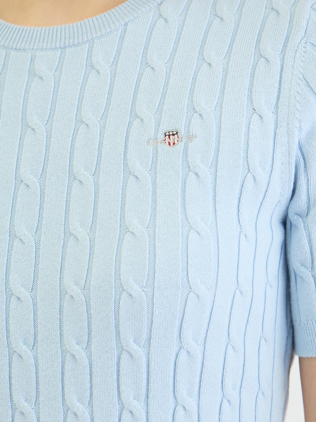 Embrace effortless style with this chic cable knit top. Crafted from a soft and comfortable cotton blend, this slim-fitting piece features a classic crew neck, short sleeves, and a timeless cable knit pattern. The slip-on closure ensures a smooth and easy fit. The rich blue hue adds a touch of sophistication, making it perfect for both casual and dressed-up occasions.