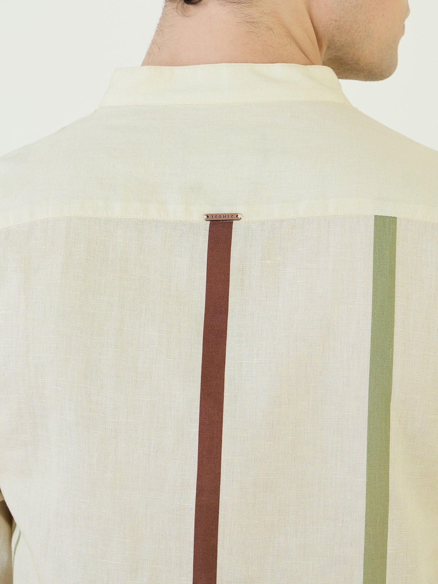 Discover the perfect blend of style and comfort with our men's beige shirt, featuring a regular fit and elegant vertical stripes. Crafted from premium cotton linen fabric, this shirt offers breathability and a soft touch, making it ideal for any occasion. The full sleeves and band collar add a touch of sophistication, while the button closure ensures a classic look. Whether you're dressing up for a meeting or going casual for a day out, this versatile shirt is a must-have addition to your wardrobe.
