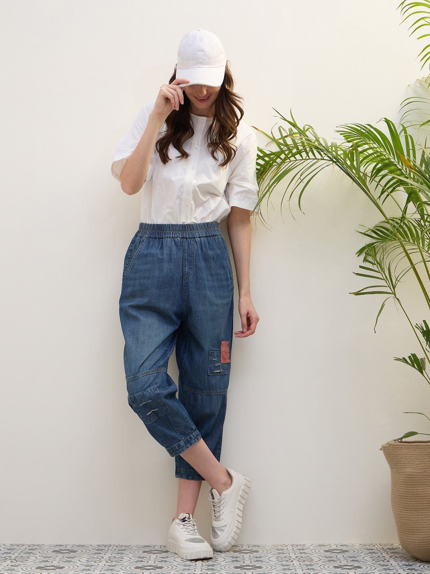 Discover the perfect blend of comfort and style with our stretchable capri jeans in a classic blue hue. Designed for women who value both fashion and ease, these jeans feature a loose fit and a solid pattern that complements any wardrobe. The mid-rise design ensures a flattering silhouette, while the elastic closure provides a secure yet flexible fit. Crafted from pure cotton fabric, these capris offer breathability and softness for all-day wear. Ideal for casual outings or relaxed weekends, they effortlessly combine practicality with chic appeal.