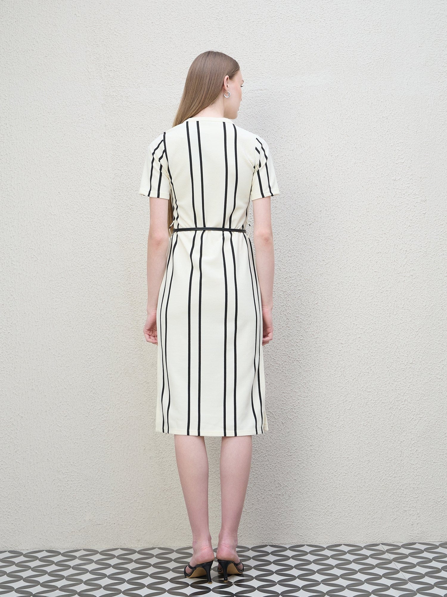 Elevate your wardrobe with this chic white midi dress, designed for the modern woman who values style and comfort. Crafted from pure cotton fabric, this dress features a flattering body fit with a classic striped pattern that adds a touch of sophistication. The short sleeves and v-placket band enhance its elegant appeal, while the button closure ensures ease of wear. An added belt accentuates your waistline, offering a tailored look. The knit stripes are stretchable, providing flexibility and comfort throughout the day. Perfect for any occasion, this dress is a versatile addition to your collection.