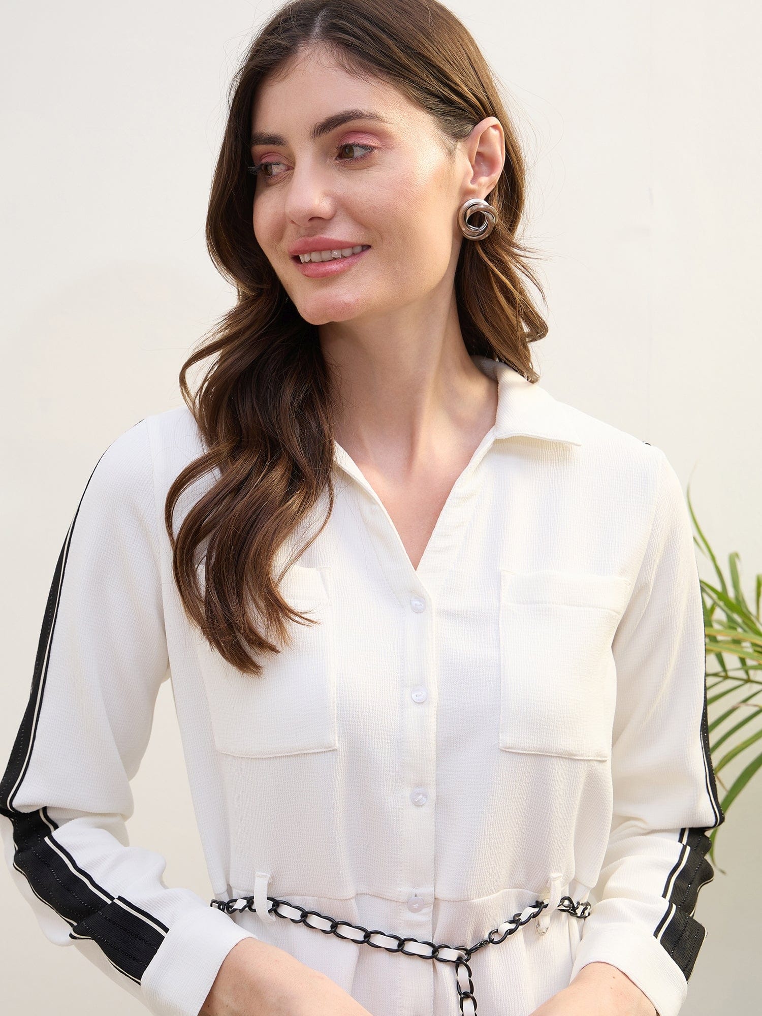 Elevate your wardrobe with our elegant shoulder tape dress in a pristine white hue. Crafted from pure cotton, this dress offers a structured pattern that exudes sophistication. The full sleeves and classic shirt collar add a touch of timeless style, while the button closure ensures a perfect fit. A chic chain belt cinches the waist, enhancing your silhouette with a modern twist. Ideal for both professional settings and casual outings, this versatile dress combines comfort and elegance, making it a must-have addition to your collection.