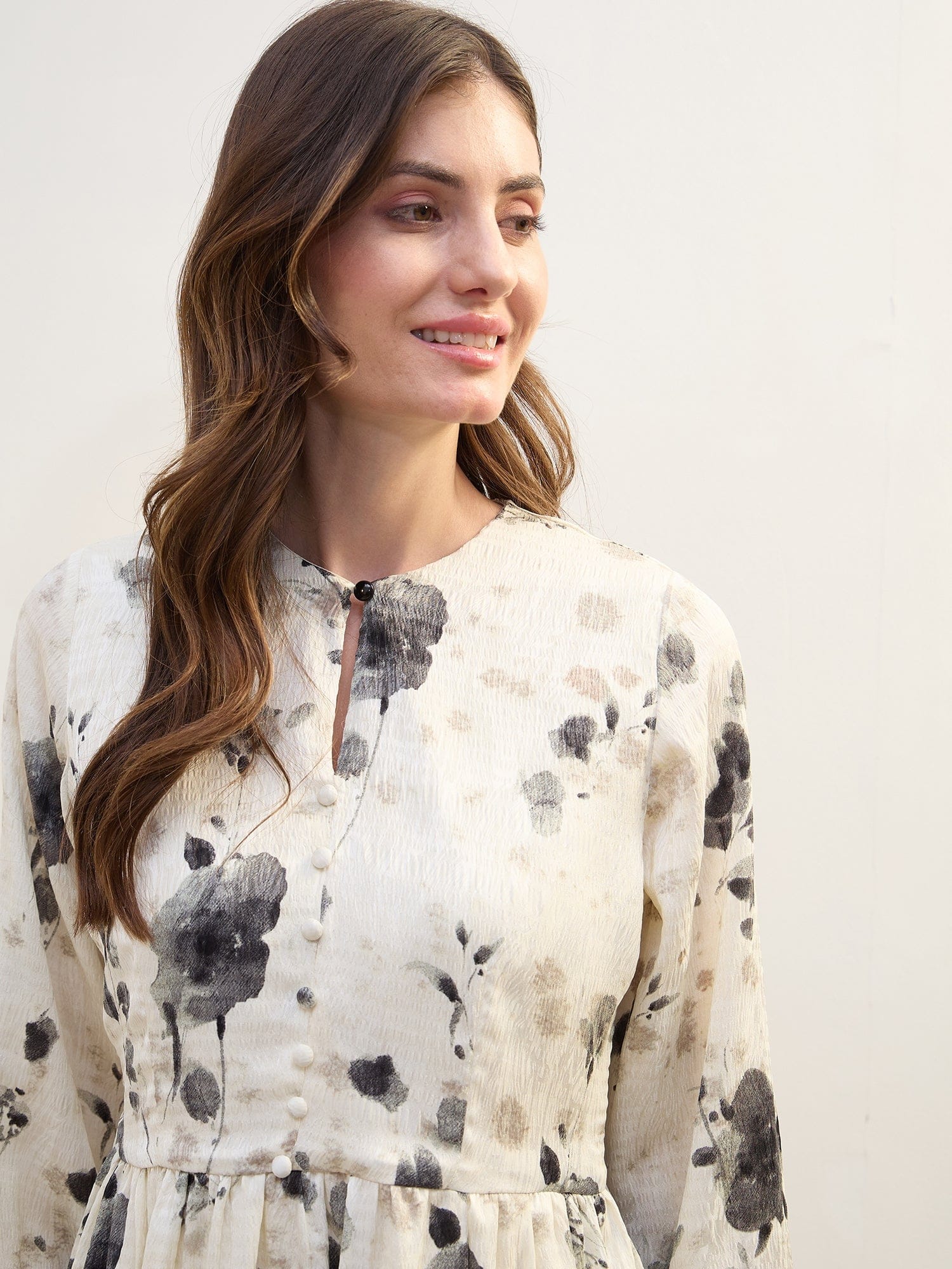 Discover elegance with our monochrome fit and flare dress in a timeless white hue. Crafted from pure cotton, this dress offers comfort and breathability, perfect for any occasion. The full sleeves and round neck design add a touch of sophistication, while the floral pattern brings a hint of femininity. Featuring a convenient button closure, this dress ensures a secure fit. Ideal for both casual outings and formal events, it effortlessly combines style and practicality, making it a must-have in your wardrobe.