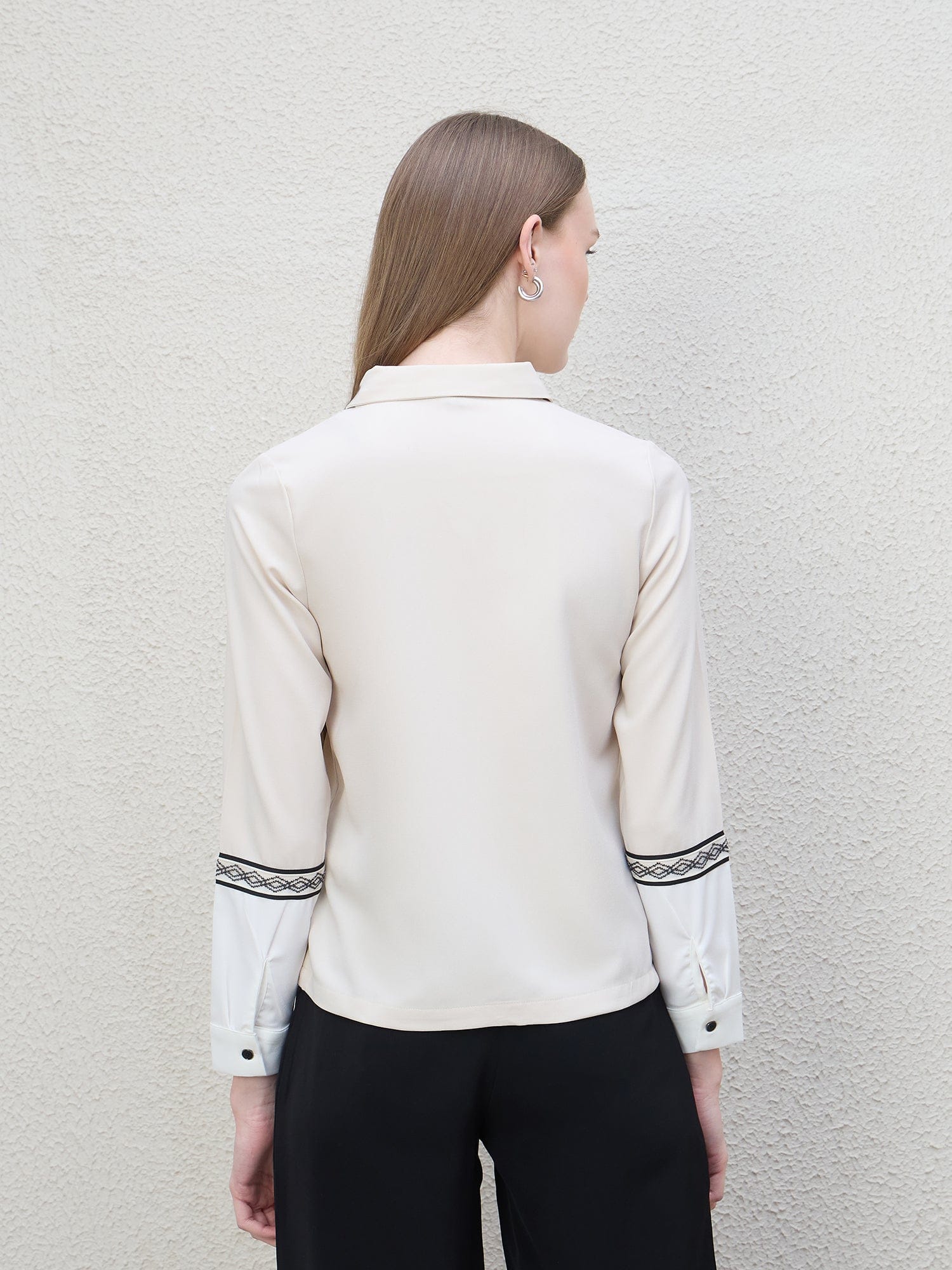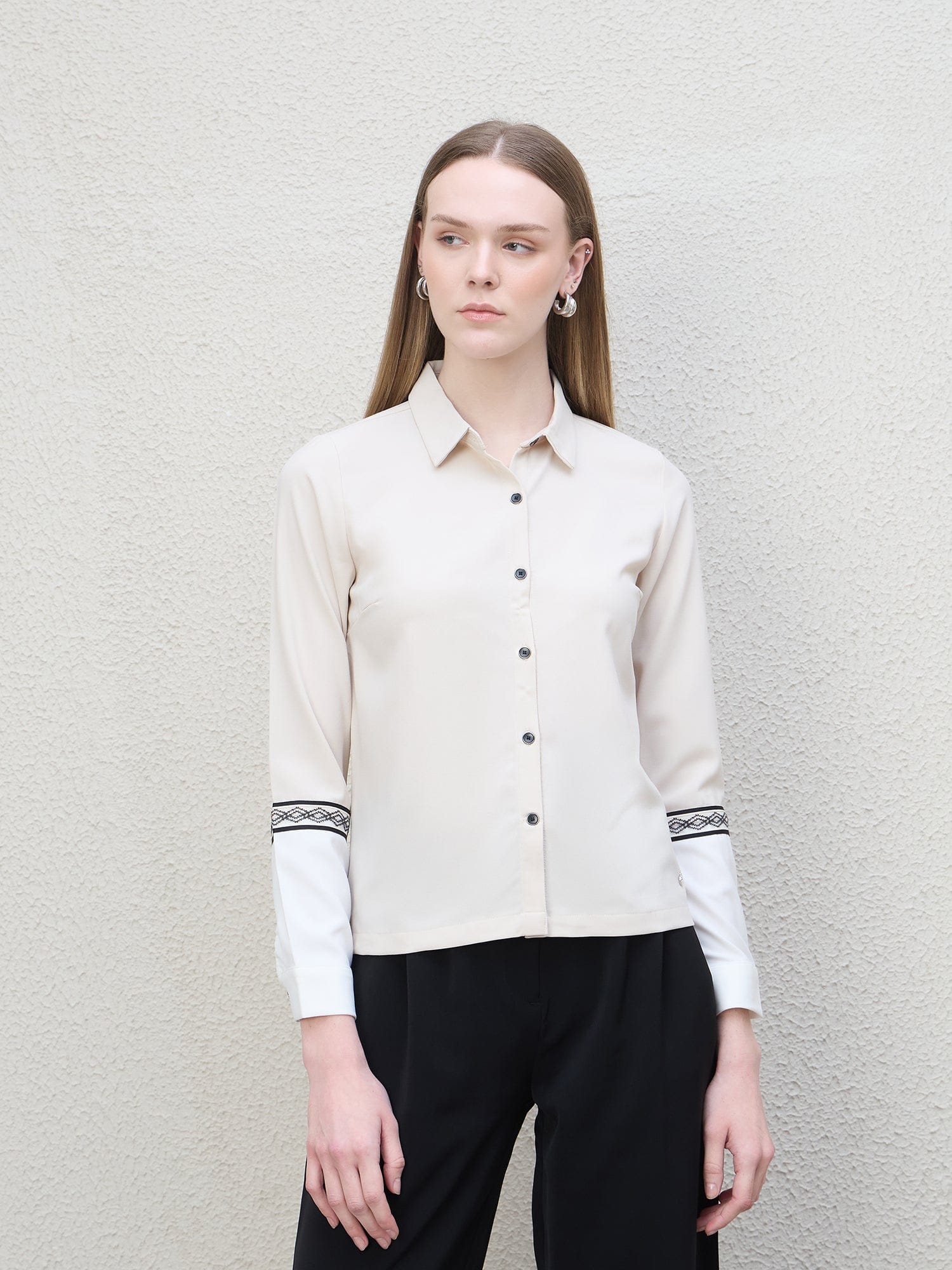 Elevate your wardrobe with this elegant beige shirt, designed for the modern woman who appreciates both style and comfort. Crafted from a high-quality polyester blend, this shirt offers a soft feel and durable wear. The solid pattern is complemented by a chic lace patch colorblock detail, adding a touch of sophistication to your ensemble. Featuring full sleeves and a classic collared neck, it ensures a polished look for any occasion. The button closure provides ease of wear while maintaining a sleek silhouette. Perfect for work or casual outings, this versatile piece is a must-have addition to your collection.