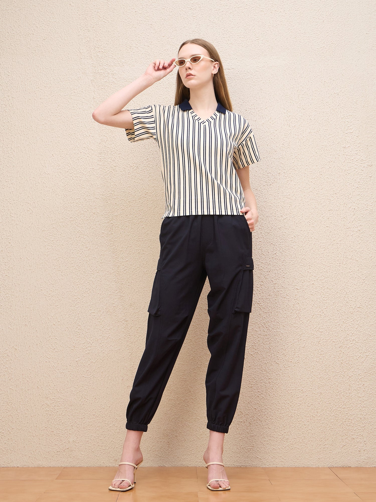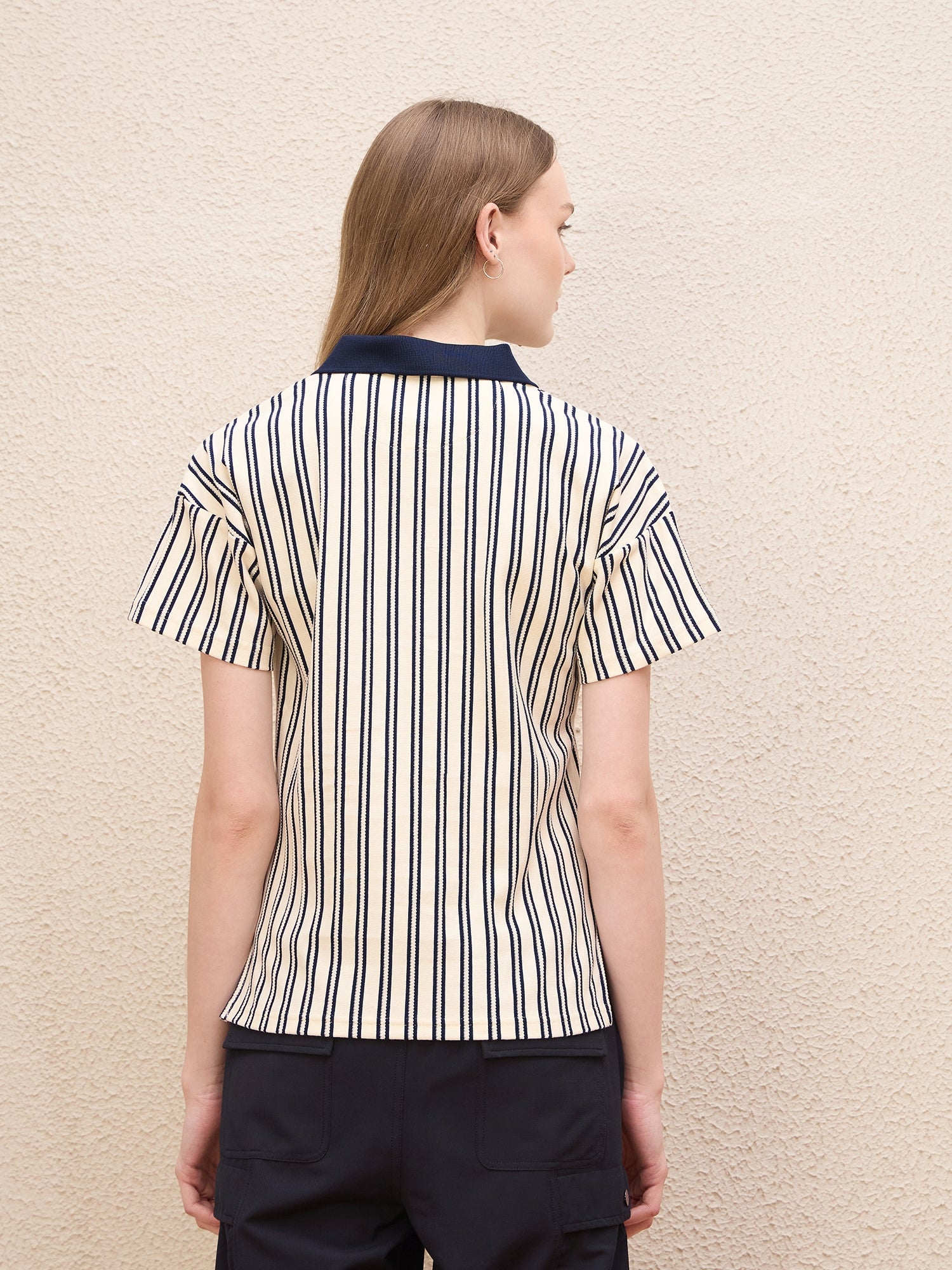Discover the perfect blend of style and comfort with our cream-colored t-shirt for women. Featuring a classic regular stripe pattern, this short sleeve tee is designed with a chic jonny collar that adds a touch of elegance to your casual wardrobe. Made from pure cotton fabric, it ensures breathability and softness against your skin. The pull-on closure offers ease of wear, while the stretchable material provides a flattering fit that moves with you. Whether youre dressing up for a day out or keeping it casual at home, this versatile t-shirt is an essential addition to your collection.