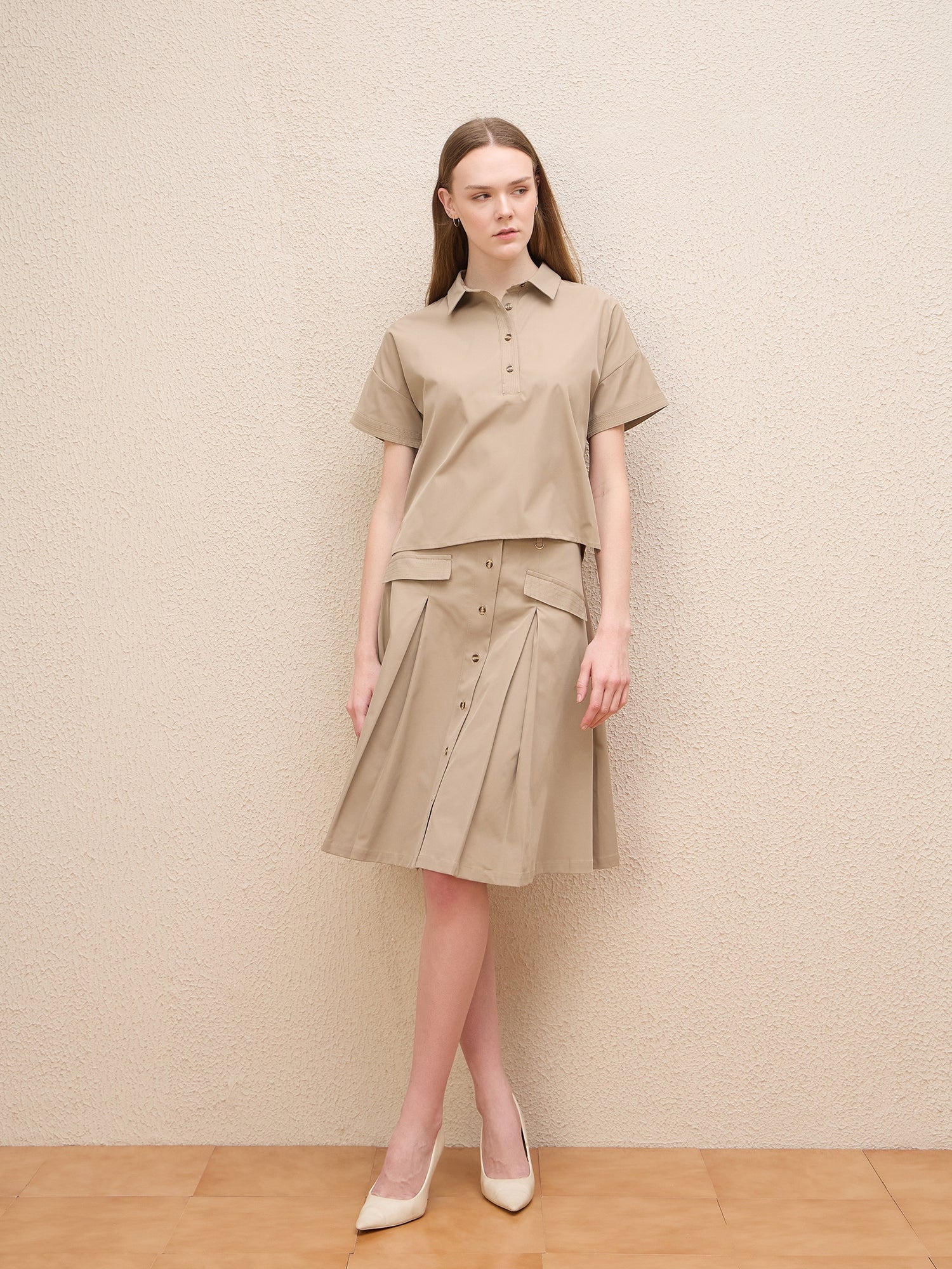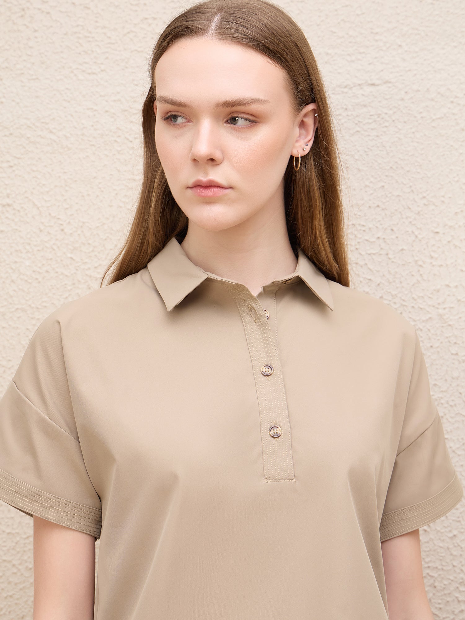 Discover effortless style with our beige t-shirt style top, designed for women who appreciate comfort and elegance. This loose-fit top features a solid pattern that complements any wardrobe. Crafted from a high-quality polyester blend fabric, it ensures durability and a soft touch against the skin. The short sleeves and classic shirt collar add a timeless appeal, while the button closure offers versatile styling options. Intricate stitch line details enhance its sophisticated look, making it perfect for both casual outings and more polished occasions. Elevate your everyday ensemble with this chic essential.