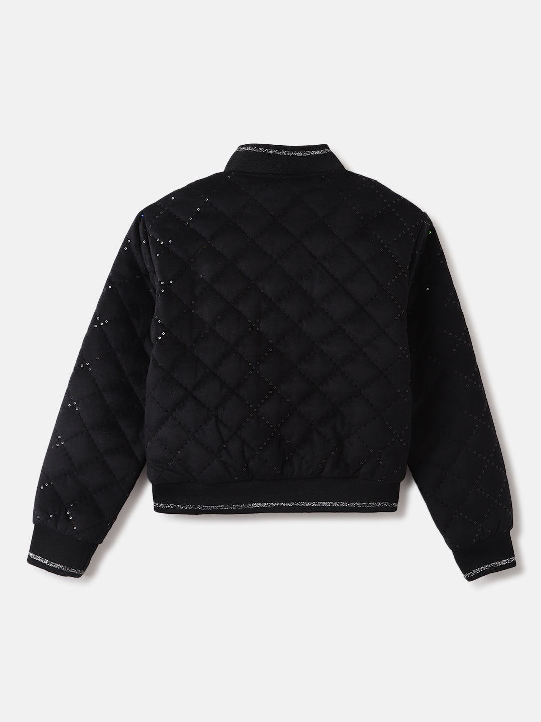 Girls Black Embellished Stand Collar Full Sleeves Quilted Jacket