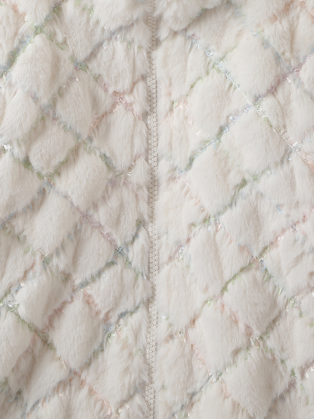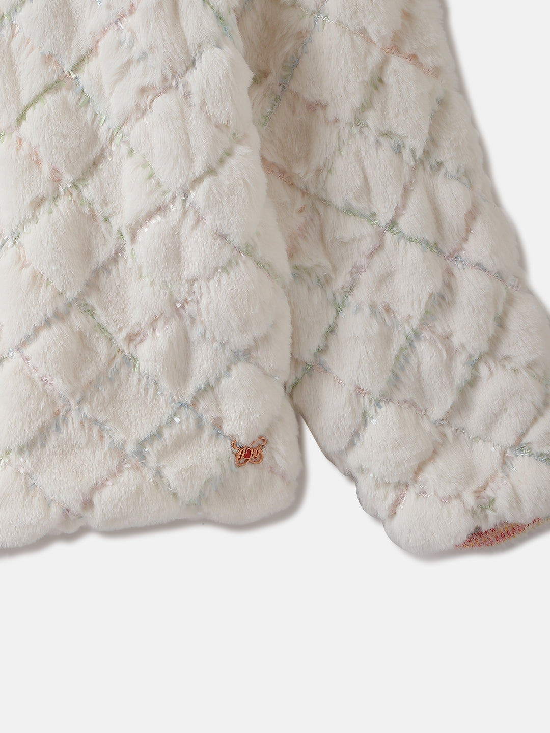 Girls Cream Self Design Stand Collar Full Sleeves Faux Fur Jacket