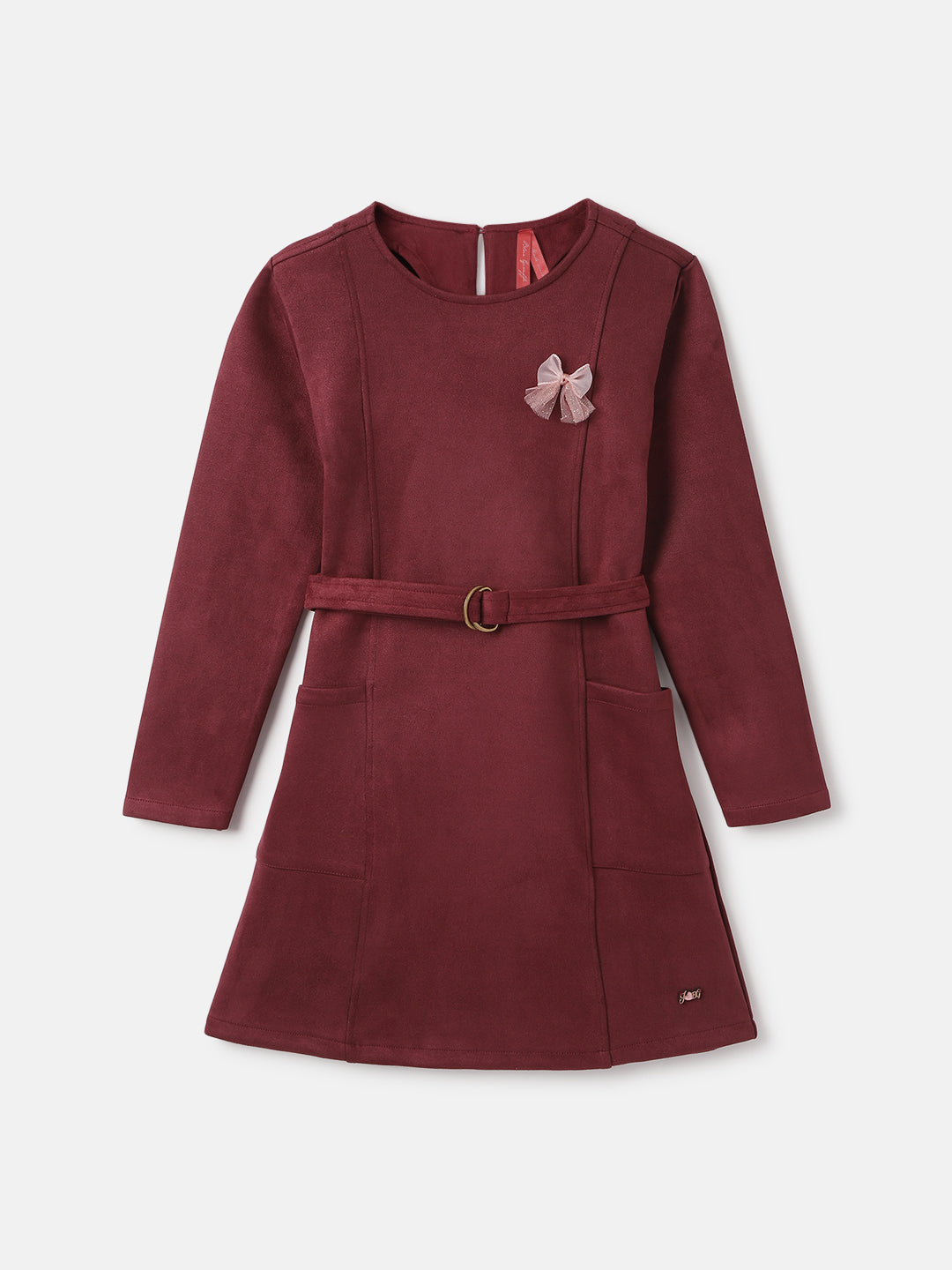 Blue Giraffe Girls Red Solid Round Neck Full Sleeves A-Line Dress