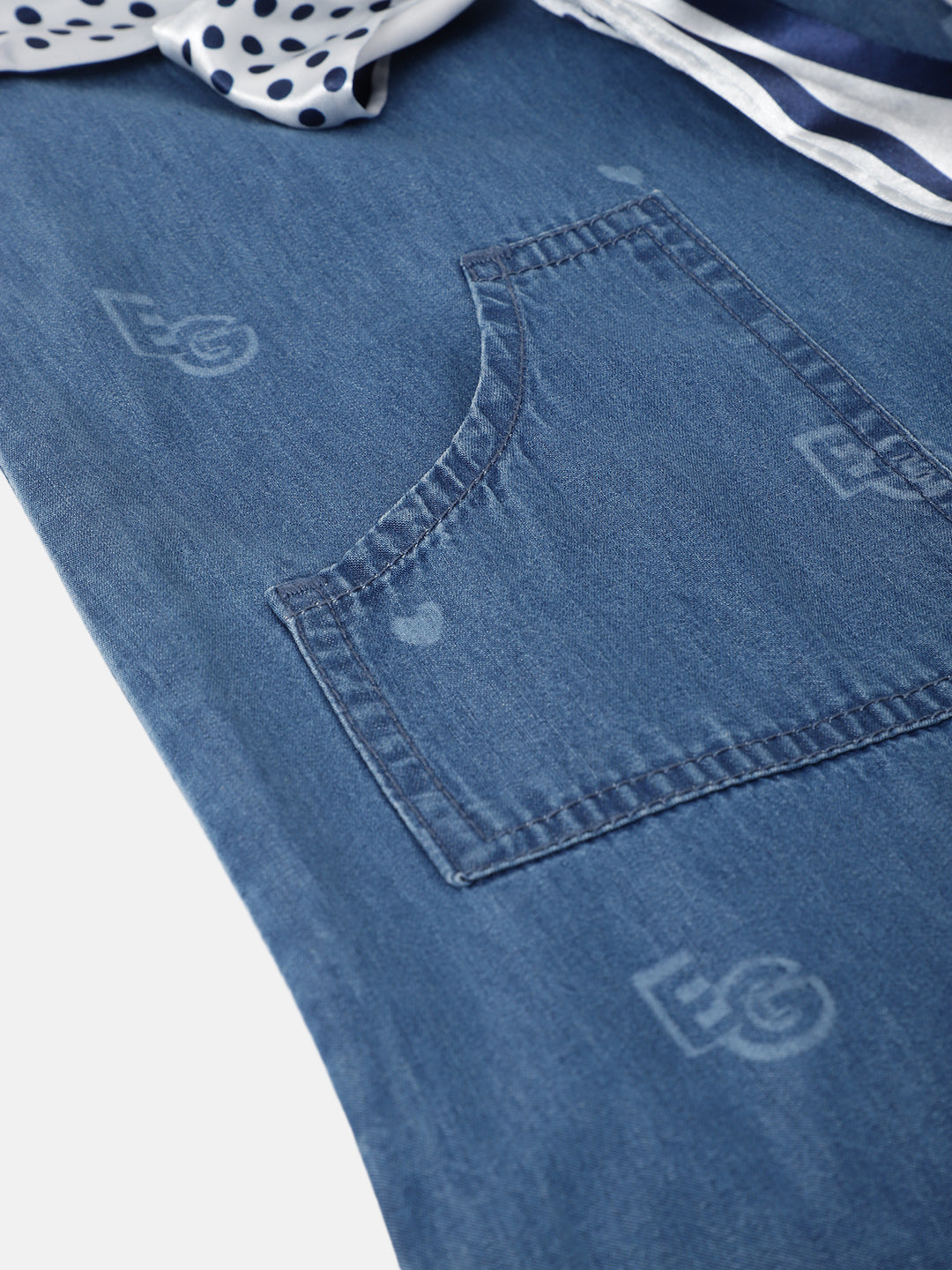 Girls Blue Printed Shirt Collar Short Sleeves Dress