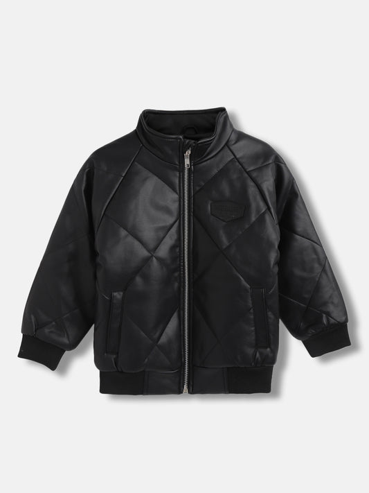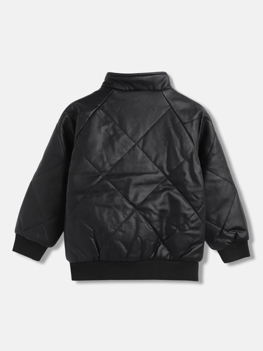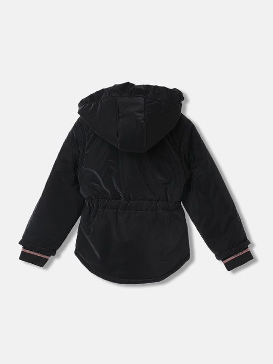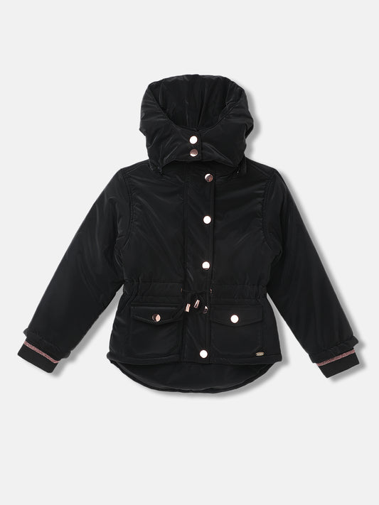 Blue Giraffe Girls Black Solid Stand Collar Full Sleeves Single Breasted Overcoat